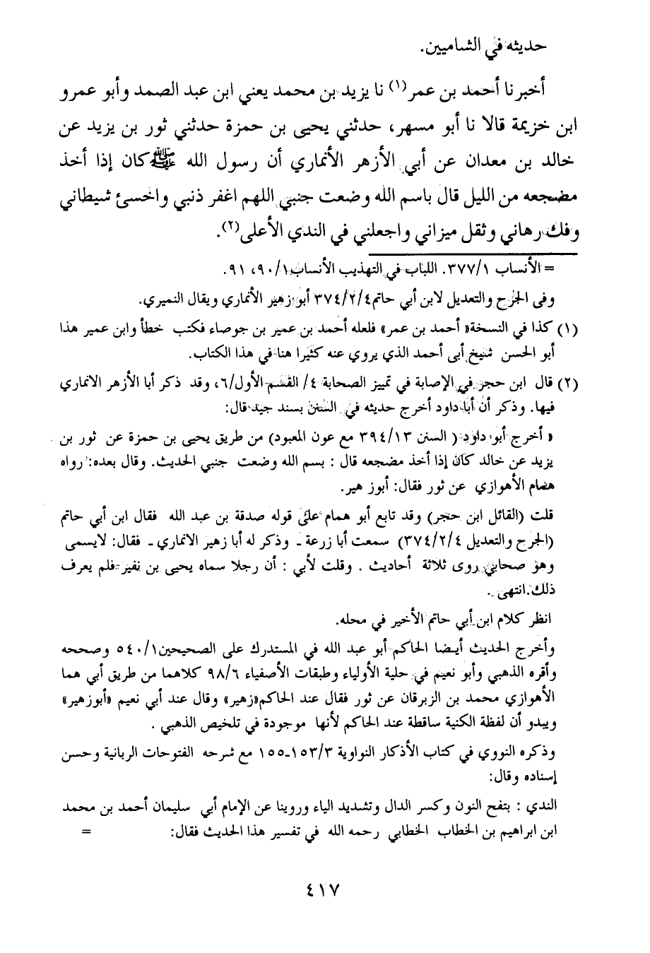 أخبرنا أحمد بن عُمَر ، حَدَّثنا يزيد بن محمد ، يَعنِي ابن عبد الصمد ، وَأبُو عَمْرو بن خزيمة قالا ، حَدَّثنا أبو مسهر حدثني يحيى بن حمزة حدثني ثور بن يزيد عن خالد بن معدان عن أبي الأزهر الأنماري أن رسول الله صلى الله عليه وسلم كان إذا أخذ مضجعة من الليل قال بسم الله وضعت جنبي اللهم اغفر ذنبي واخسىء شيطاني وفك رهاني وثقل ميزاني واجعلني في الندى الأعلى.
