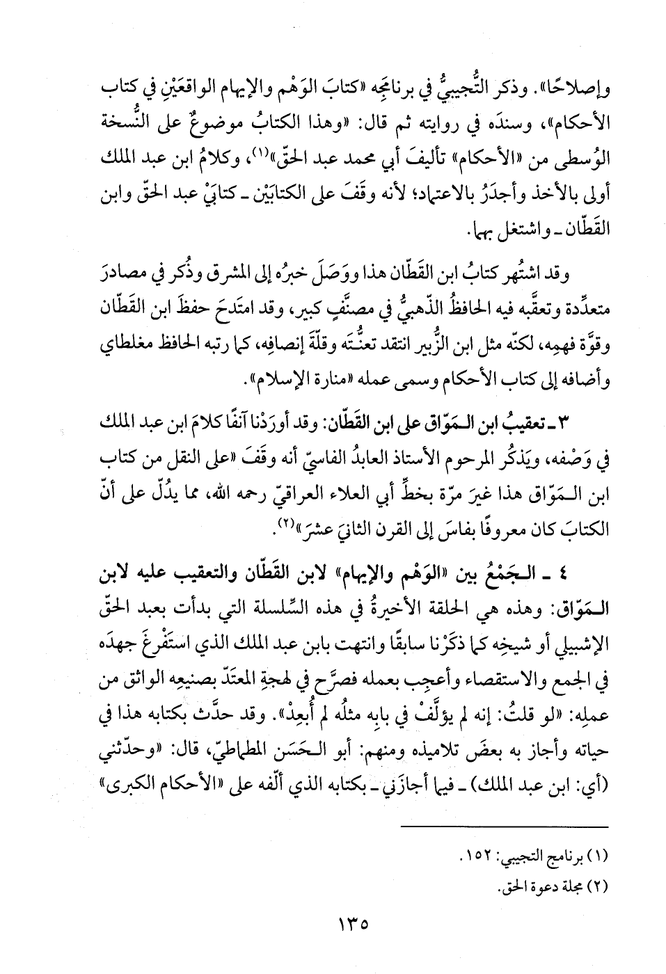 4 - الجَمْعُ بين "الوَهْم والإيهام" لابن القَطّان والتعقيب عليه لابن المَوّاق: وهذه هي الحلقة الأخيرةُ في هذه السِّلسلة التي بدأت بعبد الحقّ الإشبيلي أو شيخِه كما ذكَرْنا سابفا وانتهت بابن عبد الملك الذي استَفْرغَ جهدَه في الجمع والاستقصاء وأعجِب بعمله فصرَّح في لهجةِ المعتَدّ بصنيعِه الواثق من عملِه: "لو قلتُ: إنه لم يؤلَّفْ في بابِه مثلُه لم أُبعِدْ". وقد حدَّث بكتابه هذا في حياته وأجاز به بعضَ تلاميذه ومنهم: أبو الحَسَن المطماطيّ، قال: "وحدّثني (أي: ابن عبد الملك) - فيما أجازَني- بكتابه الذي ألّفه على "الأحكام الكبرى"