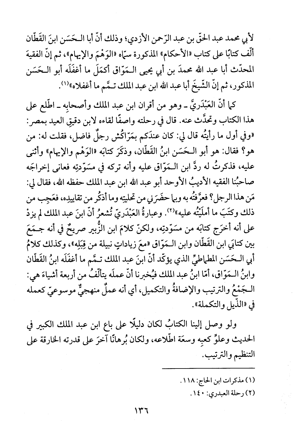 كما أنّ العَبْدَريَّ -وهو من أقران ابن عبد الملك وأصحابِه- اطّلع على هذا الكتاب وتحدث عنه. قال في رحلته واصفًا لقاءه لابن دقيقِ العيد بمصر: "وفي أول ما رأيتُه قال لي: كان عندَكم بمَرّاكُش رجل فاضل، فقلت له: من هو؟ فقال: هو أبو الحَسَن ابنُ القَطّان، وذكَرَ كتابَه "الوَهْم والإيهام" وأثنى عليه، فذكرتُ له ردَّ ابن المَوّاق عليه وأنه تركه في مسَوّدتِه فعانى إخراجَه صاحبُنا الفقيه الأديبُ الأوحد أبو عبد الله ابن عبد الملك حفظه الله، فقال لي: مَن هذا الرجل؟ فعرَّفتُه به وبما حضَرَني من تحليتِه وما أذكُر من تقاييدِه، فعَجِب من ذلك وكتَبَ ما أملَيْتُه عليه" (¬2). وعبارةُ العَبْدَريّ تُشعرُ أنّ ابنَ عبد الملك لم يزدْ على أنه أخرَج كتابَه من مسَوّدتِه، ولكنّ كلامَ ابن الزُّبير صريحٌ في أنه جمَعَ بين كتابَي ابن القَطّان وابن المَوّاق "معَ زياداتٍ نبيلة من قِبَلِه"، وكذلك كلامُ أبي الحَسَن المطماطيِّ الذي يؤكّد أنّ ابنَ عبد الملك تمَّم ما أغفَلَه ابنُ القَطّان وابنُ المَوّاق، أمّا ابنُ عبد الملك فيُخبرنا أنّ عملَه يتألّفُ من أربعة أشياءَ هي: الجَمْعُ والترتيب والإضافةُ والتكميل، أي أنه عمل منهجيّ موسوعيّ كعمله في "الذّيل والتكملة".