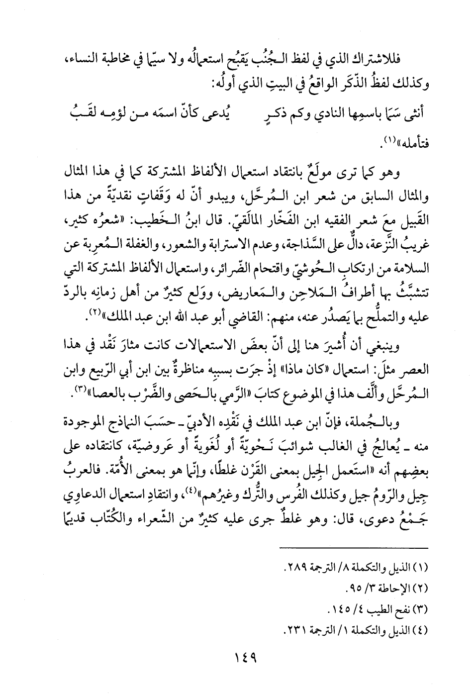وهو كما ترى مولَع بانتقاد استعمال الألفاظ المشتركة كما في هذا المثال والمثال السابق من شعر ابن المُرحَّل، ويبدو أنّ له وَقَفاتٍ نقديّةً من هذا القَبيل معَ شعر الفقيه ابن الفَخّار المالَقيّ. قال ابنُ الخَطيب: "شعرُه كثير، غريبُ النَّزعة، دالٌّ على السَّذاجة، وعدم الاسترابة والشعور، والغفلة المُعرِبة عن السلامة من ارتكابِ الحُوشيّ واقتحام الضّرائر، واستعمال الألفاظ المشتركة التي تتشبَّثُ بها أطرافُ المَلاحِن والمَعاريض، ووَلع كثيرٌ من أهل زمانِه بالردّ عليه والتملُّح بما يَصدُر عنه، منهم: القاضي أبو عبد الله ابن عبد الملك" (¬2).