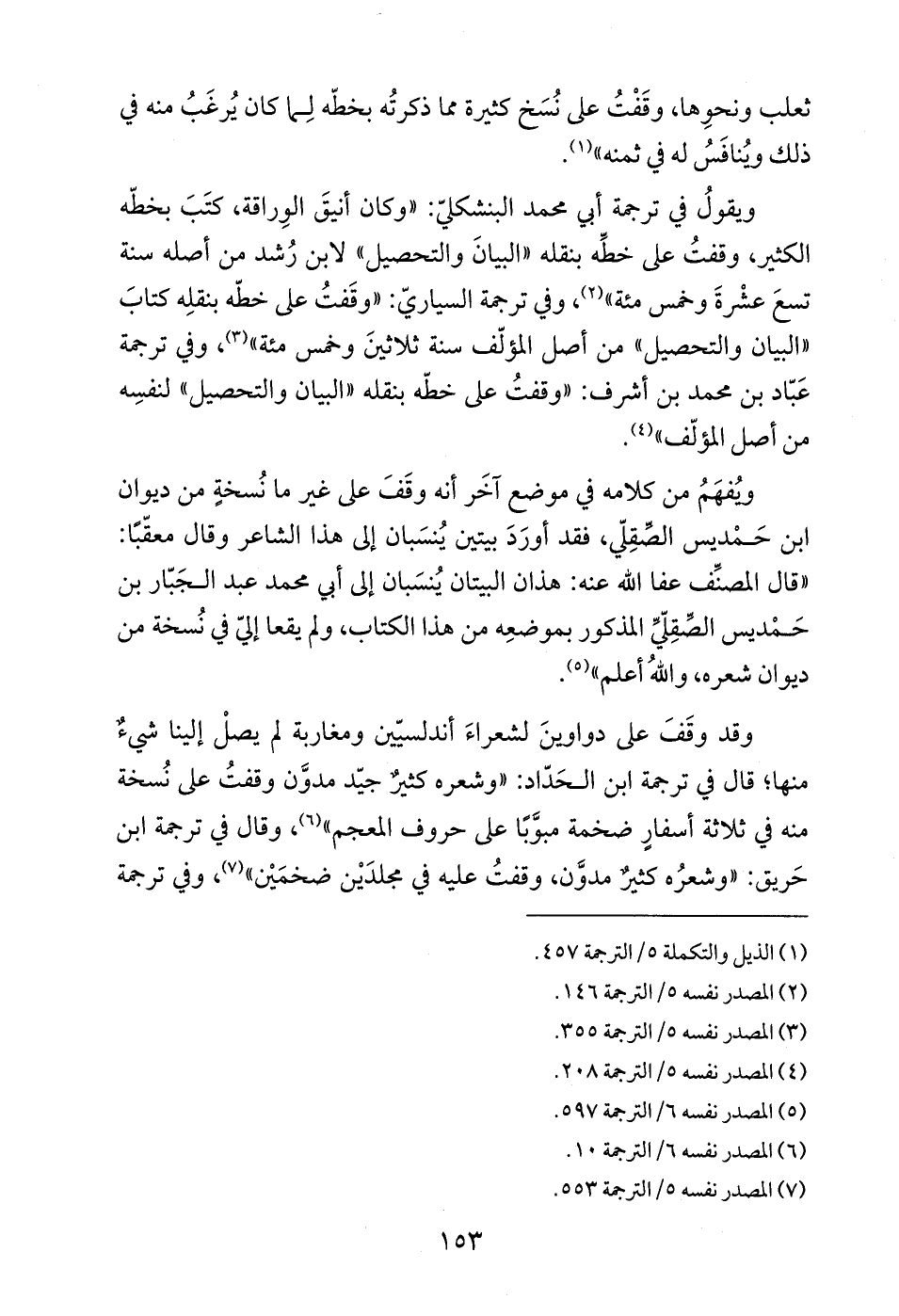 ويقولُ في ترجمة أبي محمد البنشكليّ: "وكان أنيقَ الوِراقة، كتَبَ بخطّه الكثير، وقفتُ على خطِّه بنقله "البيانَ والتحصيل" لابن رُشد من أصله سنة تسعَ عشْرةَ وخمس مئة" (¬2)، وفي ترجمة السياريّ: "وقَفتُ على خطّه بنقلِه كتابَ "البيان والتحصيل" من أصل المؤلّف سنة ثلاثينَ وخمس مئة" (¬3)، وفي ترجمة عَبّاد بن محمد بن أشرف: "وقفتُ على خطّه بنقله "البيان والتحصيل" لنفسِه من أصل المؤلّف" (¬4).