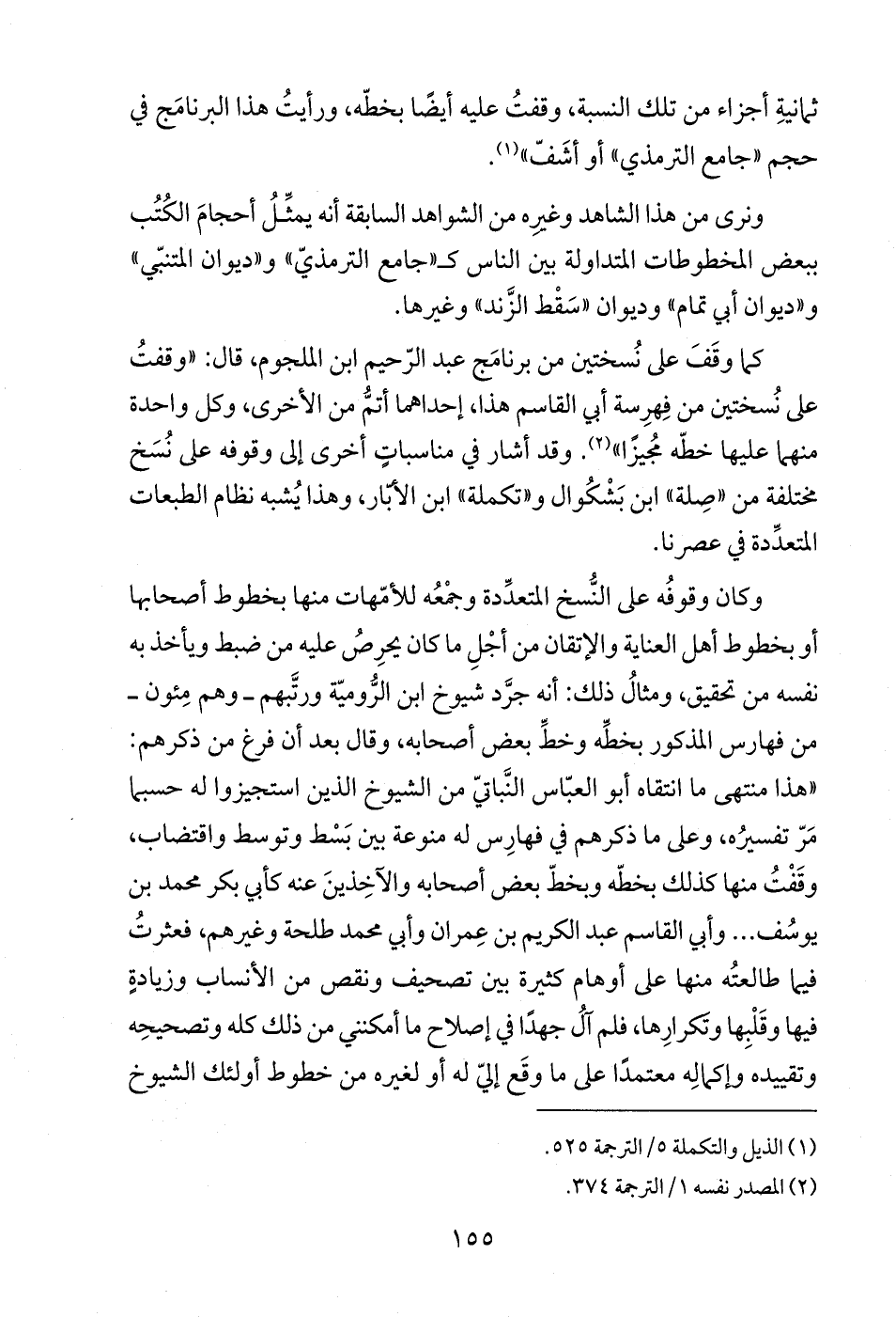 كما وقَفَ على نُسختين من برنامَج عبد الرّحيم ابن الملجوم، قال: "وقفتُ على نُسختين من فِهرِسة أبي القاسم هذا، إحداهما أتمُّ من الأخرى، وكل واحدة منهما عليها خطّه مجُيزًا" (¬2). وقد أشار في مناسباتٍ أخرى إلى وقوفه على نُسَخ مختلفة من "صِلة" ابن بَشْكُوال و"تكملة" ابن الأبّار، وهذا يُشبه نظام الطبعات المتعدِّدة في عصرنا.