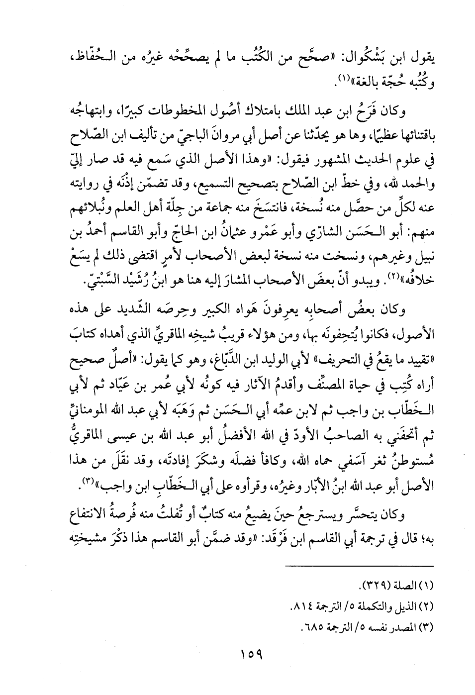 وكان فَرَحُ ابن عبد الملك بامتلاك أصُول المخطوطات كبيرًا، وابتهاجُه باقتنائها عظيمًا، وها هو يحدّثنا عن أصل أبي مروانَ الباجيّ من تأليف ابن الصّلاح في علوم الحديث المشهور فيقول: "وهذا الأصل الذي سَمع فيه قد صار إليّ والحمد لله، وفي خطّ ابن الصّلاح بتصحيح التسميع، وقد تضمّن إذْنَه في روايته عنه لكلِّ من حصَّل منه نُسخة، فانتسَخَ منه جماعة من جِلّة أهل العلم ونُبلائهم منهم: أبو الحَسَن الشارّي وأبو عَمْرو عثمانُ ابن الحاجّ وأبو القاسم أحمدُ بن نبيل وغيرهم، ونسخت منه نسخة لبعض الأصحاب لأمرٍ اقتضى ذلك لم يسَعْ خلافُه" (¬2). ويبدو أنّ بعضَ الأصحاب المشارَ إليه هنا هو ابنُ رُشَيْد السَّبْتيّ.
