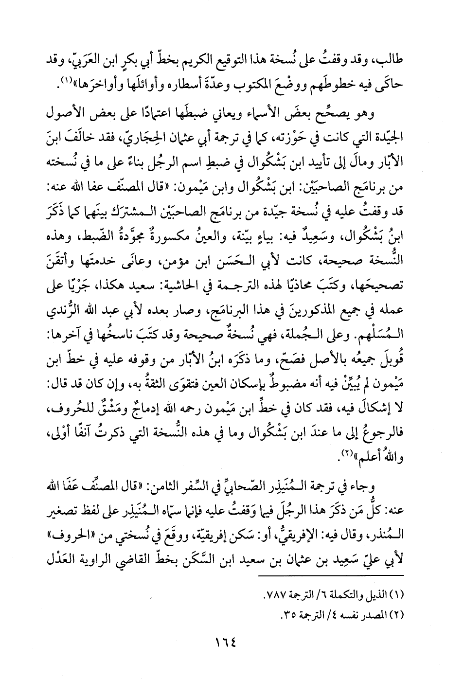 وهو يصحِّح بعضَ الأسماء ويعاني ضبطَها اعتمادًا على بعض الأصول الجيّدة التي كانت في حَوْزته، كما في ترجمة أبي عثمان الحِجَاريّ، فقد خالَفَ ابنَ الأبّار ومالَ إلى تأييد ابن بَشْكُوال في ضبطِ اسم الرجُل بناءً على ما في نُسخته من برنامَج الصاحبَيْن: ابن بَشْكُوال وابن مَيْمون: "قال المصنف عفا الله عنه: قد وقفتُ عليه في نُسخة جيّدة من برنامَج الصاحبَيْن المشترَك بينَهما كما ذَكَرَ ابنُ بَشْكُوال، وسَعِيدٌ فيه: بياءٍ بيّنة، والعينُ مكسورةٌ مجودةُ الضّبط، وهذه النُسخة صحيحة، كانت لأبي الحَسَن ابن مؤمن، وعانَى خدمتَها وأتقَنَ تصحيحَها، وكتَبَ محاذيًا لهذه الترجمة في الحاشية: سعيد هكذا، جَرْيًا على عمله في جميع المذكورينَ في هذا البرنامَج، وصار بعده لأبي عبد الله الرُّندي المُسَلْهم. وعلى الجُملة، فهي نُسخة صحيحة وقد كتَبَ ناسخُها في آخرها: قُوبلَ جميعُه بالأصل فصَحّ، وما ذكَرَه ابنُ الأبّار من وقوفه عليه في خطّ ابن مَيْمون لم يُبيِّنْ فيه أنه مضبوطٌ بإسكان العين فتقوَى الثقةُ به، وإن كان قد قال: لا إشكالَ فيه، فقد كان في خط ابن مَيْمون رحمه الله إدماجٌ ومَشْقٌ للحُروف، فالرجوعُ إلى ما عندَ ابن بَشْكُوال وما في هذه النُسخة التي ذكرتُ آنفًا أوْلى، واللهُ أعلم" (¬2).