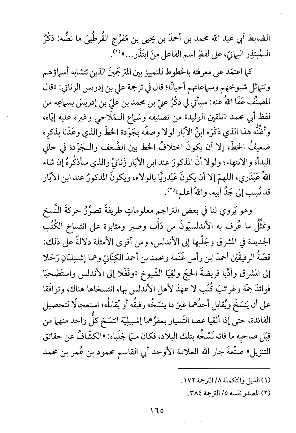 وهو يَروي لنا في بعض التراجم معلوماتٍ طريفةً تصوِّرُ حركةَ النَّسخ وتمثِّلُ ما عُرف به الأندلسيّونَ من دَأْب وصبر ومثابرة على انتساخ الكُتُب الجديدة في المشرق وجَلْبها إلى الأندلس، ومن أقوى الأمثلة دلالةً على ذلك: قصّةُ الرفيقَيْن أحمدَ ابن رأس غَنَمة ومحمد بن أحمدَ الكِنَانيّ وهما إشبيليّانِ رَحَلا إلى المشرق وأدَّيا فريضةَ الحجّ ولقِيَا الشّيوخ "وقَفَلا إلى الأندلس واستَصْحبَا فوائدَ جمّة وغرائبَ كُتُب لا عهدَ لأهل الأندلس بها، انتسخاها هناك، وتوافَقا على أن يَنسَخَ ويُقابل أحدُهما غيرَ ما ينسَخُه رفيقُه أو يُقابلُه، استعجالًا لتحصيل الفائدة، حتى إذا ألقيا عصا التّسيار بمقرِّهما إشبيلِيَة انتسَخ كلُّ واحد منهما من قِبَل صاحبِه ما فاته نَسْخُه بتلك البلاد، فكان ممّا جَلَباه: "الكشّافُ عن حقائق التنزيل" صنْعةَ جار الله العلامة الأوحد أبي القاسم محمود بن عُمر بن محمد