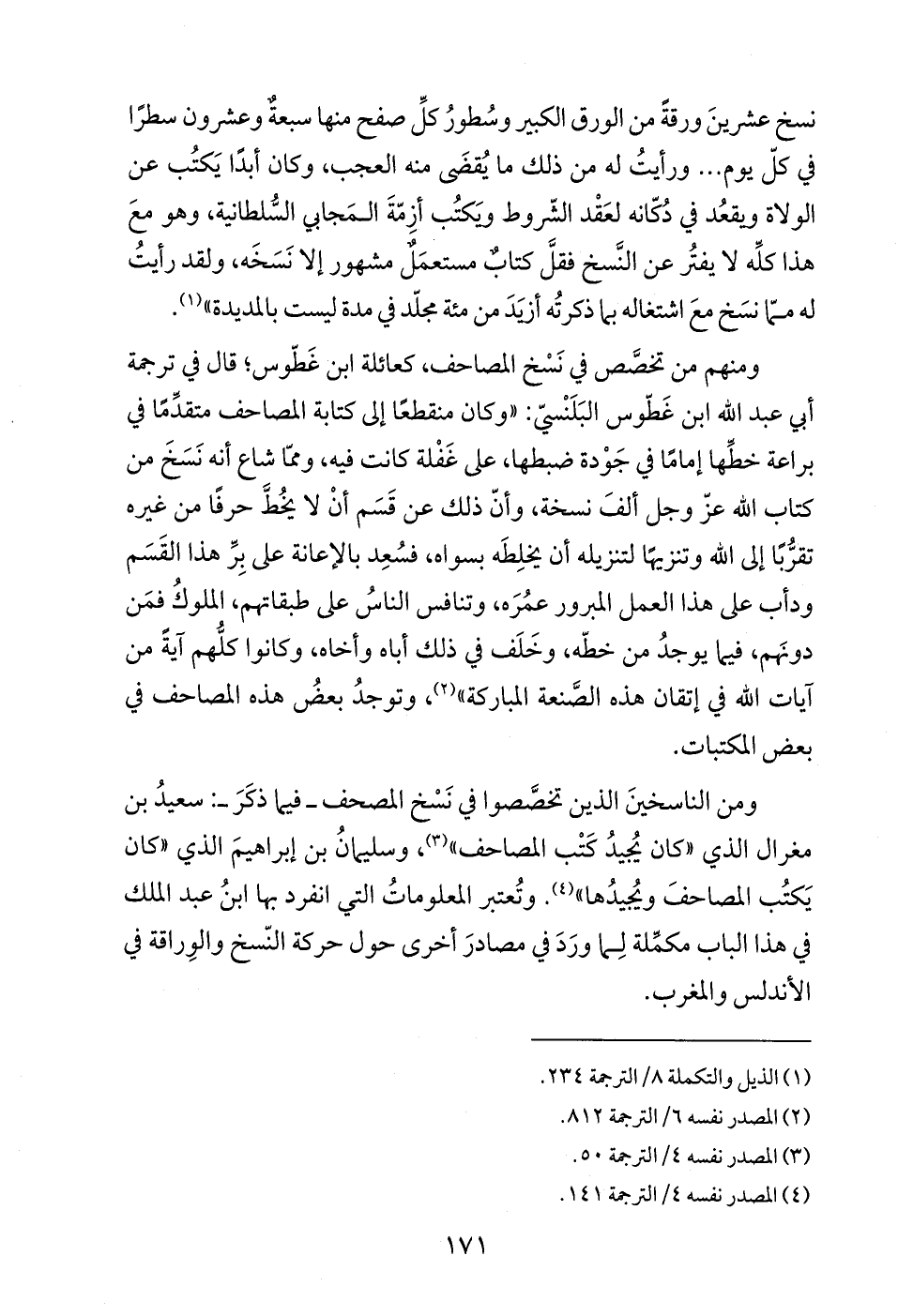 ومن الناسخينَ الذين تخصَّصوا في نَسْخ المصحف -فيما ذكَرَ-: سعيدُ بن مغرال الذي "كان يُجيدُ كَتْب المصاحف" (¬3)، وسليمانُ بن إبراهيمَ الذي "كان يَكتُب المصاحفَ ويُجيدُها" (¬4). وتُعتبر المعلوماتُ التي انفرد بها ابنُ عبد الملك في هذا الباب مكمِّلة لِما ورَدَ في مصادرَ أخرى حول حركة النّسخ والوِراقة في الأندلس والمغرب.