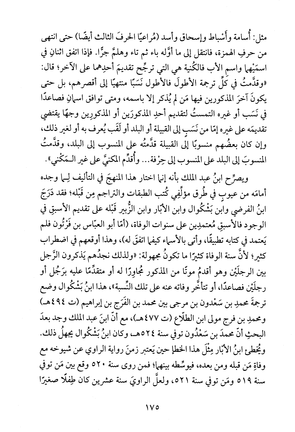 مثل: أُسامة وأَسْباط وإسحاق وأسد (مُراعيًا الحرفَ الثالث أيضًا) حتى انتهى من حرفِ الهمزة، فانتقل إلى ما أوَّله باء ثم تاء وهلمَّ جرًّا. فإذا اتفق اثنانِ في اسمَيْهما واسمِ الأب فالكُنية هي التي ترجِّح تقديمَ أحدِهما على الآخر؛ قال: "وقدَّمتُ في كلِّ ترجمة الأطولَ فالأطول نَسَبًا منتهيًا إلى أقصرهم، بل حتى يكونَ آخرَ المذكورين فيها مَن لم يُذكر إلا باسمه، ومتى توافق اسمانِ فصاعدًا في نَسَب أو غيره التمستُ لتقديم أحدِ المذكورَين أو المذكورِين وجهًا يقتضي تقديمَه على غيره إمّا من نَسَبٍ إلى القبيلة أو البلد أو لَقَب يُعرف به أو لغير ذلك، وإن كان بعضُهم منسوبًا إلى القبيلة قدَّمتُه على المنسوب إلى البلد، وقدَّمتُ المنسوبَ إلى البلد على المنسوب إلى حِرْفة ... وأُقدِّم المكنيَّ على غير المَكْني".