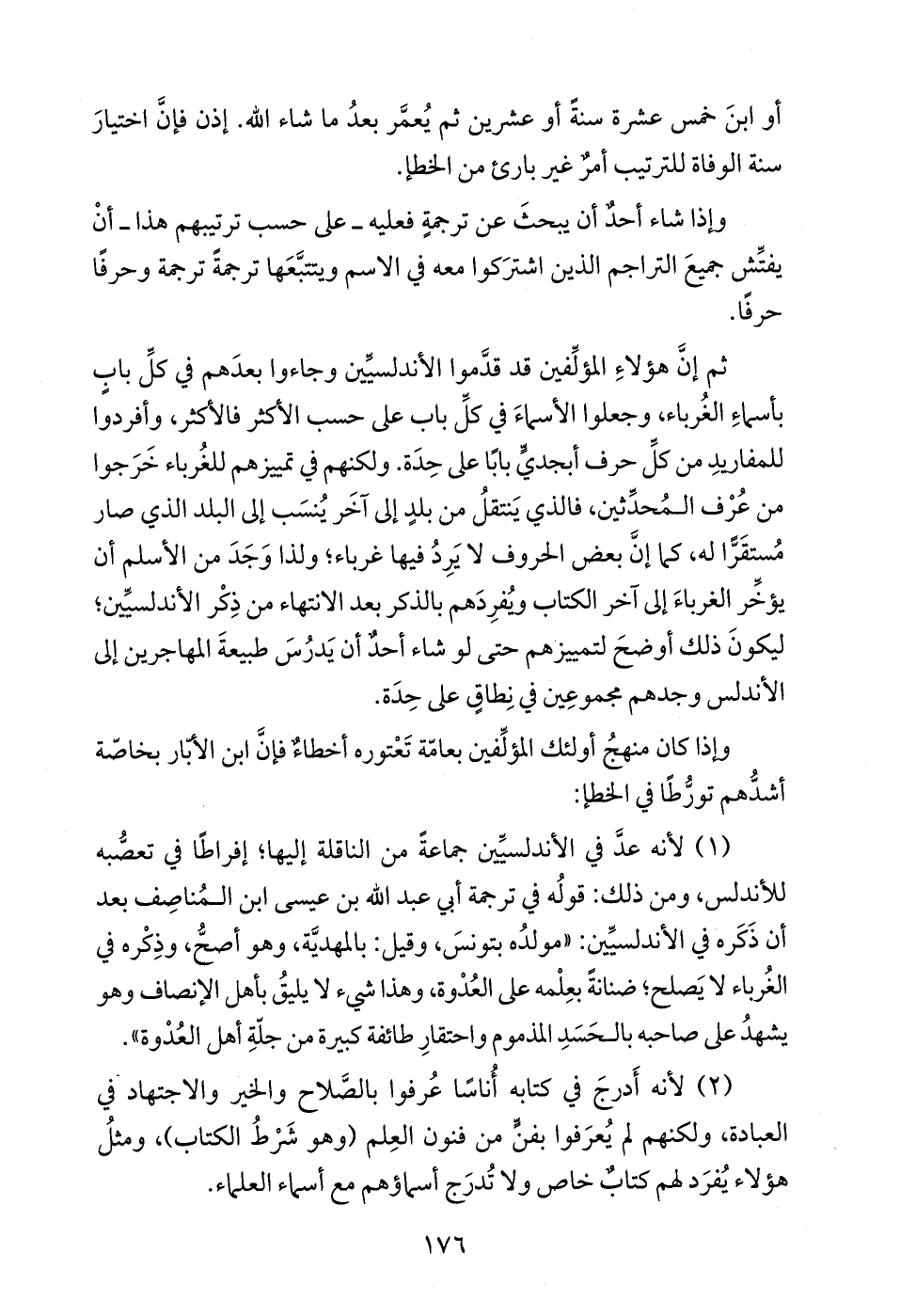 (1) لأنه عدَّ في الأندلسيِّين جماعةً من الناقلة إليها؛ إفراطًا في تعصُّبه للأندلس، ومن ذلك: قولُه في ترجمة أبي عبد الله بن عيسى ابن المُناصِف بعد أن ذَكَره في الأندلسيِّين: "مولدُه بتونسَ، وقيل: بالمهديَّة، وهو أصحُّ، وذِكْره في الغُرباء لا يَصلح؛ ضنانةً بعِلْمه على العُدْوة، وهذا شيء لا يليقُ بأهل الإنصاف وهو يشهدُ على صاحبه بالحَسَدِ المذموم واحتقارِ طائفة كبيرة من جلّةِ أهل العُدْوة".