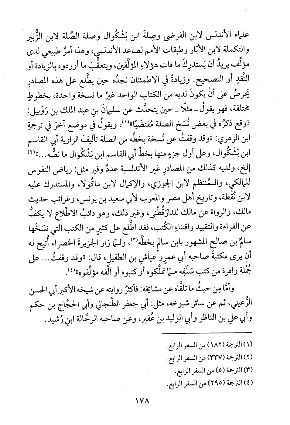 علماء الأندلس لابن الفرضي وصلةَ ابن بَشْكُوال وصلة الصلة لابن الزُّبير والتكملة لابن الأبّار وطبقات الأمم لصاعد الأندلسي، وهذا أمرٌ طبيعي لدى مؤلِّف يريدُ أن يَستدرِكَ ما فات هؤلاءِ المؤلِّفين، ويتعقُّبَ ما أوردوه بالزيادة أو النَّقدِ أو التصحيح. وزيادةً في الاطمئنان نجدُه حين يطَّلع على هذه المصادرِ يَحرصُ على أنْ يكونَ لديه من الكتاب الواحد غيرُ ما نسخة واحدة، بخطوطٍ مختلفة، فهو يقولُ -مثلًا- حين يتحدَّث عن سليمانَ بنِ عبد الملك بن رَوْبيل: "وقع ذكرُه في بعض نُسَخ الصلة مُقتضَبًا" (¬1)، ويقولُ في موضع آخرَ في ترجمةِ ابن الزهري: "وقد وقفتُ على نُسخة بخطِّه من الصلة تأليفَ الراوية أبي القاسم ابن بَشْكُوال، وعلى أول جزء منها بخطِّ أبي القاسم ابن بَشْكُوال ما نصُّه ... " (¬2) إلخ، ولديه كذلك من المصادرِ غير الأندلسية عددٌ وفير مثل: رياض النفوس للمالكي، والمُنتظم لابن الجوزي، والإكمال لابن ماكُولا، والمستدرك عليه لابن نُقْطة، وتاريخ أهل مصر والمغرب لأبي سعيد بن يونس، وغرائب حديث مالك، والرواة عن مالك للدارَقُطْني، وغير ذلك، وهو دائبُ الاطِّلاع لا يكفُّ عن القراءة والتقييد واقتناءِ الكُتب، فقد اطَّلع على كثير من الكتب التي نسَخَها سالمُ بن صالح المشهور بابن سالمٍ بخطِّه (¬3)، ولمّا زار الجزيرةَ الخضراء أُتيح له أن يرى مكتبةَ صاحبه أبي عمرٍ وعياشِ بن الطفيل، قال: "وقد وقفتُ ... على جُمْلة وافرة من كتب سَلَفِه ممّا تملَّكوه أو كتبوه أو ألَّفه مؤلِّفوه" (¬4).