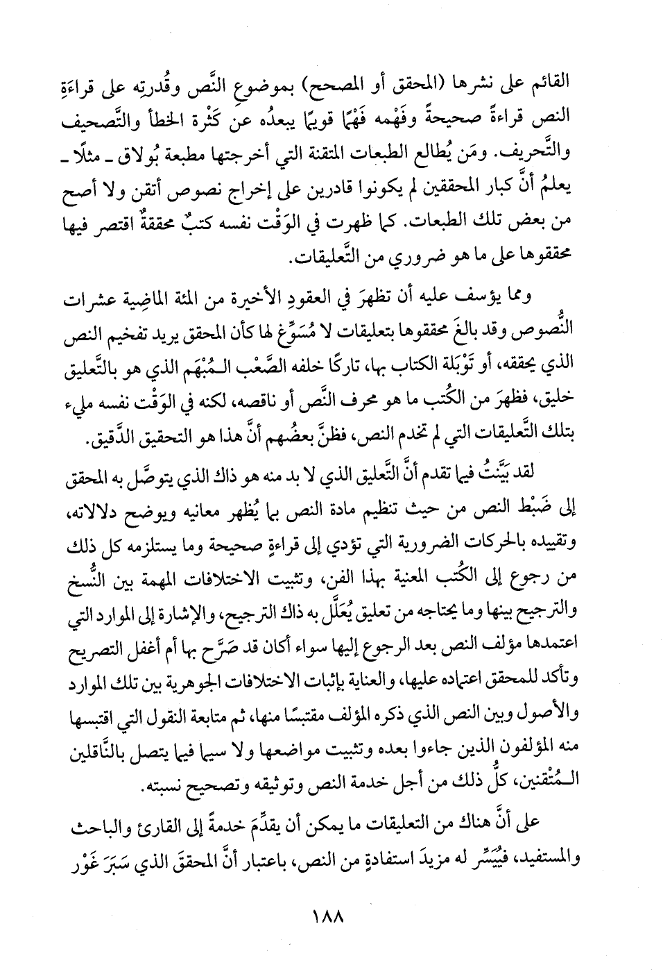 ومما يؤسف عليه أن تظهرَ في العقودِ الأخيرة من المئة الماضِية عشرات النُّصوص وقد بالغَ محققوها بتعليقات لا مُسَوِّغ لها كأن المحقق يريد تفخيم النص الذي يحققه، أو تَوْبَلة الكتاب بها، تاركًا خلفه الصَّعْب المُبْهَم الذي هو بالتَّعليق خليق، فظهرَ من الكُتب ما هو محرف النَّص أو ناقصه، لكنه في الوَقْت نفسه مليء بتلك التَّعليقات التي لم تخدم النص، فظنَّ بعضُهم أنَّ هذا هو التحقيق الدَّقيق.