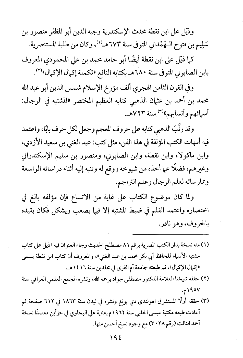 (¬1) منه نسخة بدار الكتب المصرية برقم 81 مصطلح الحديث وجاء العنوان فيها ذيل على كتاب مشتبه الأسماء للحافظ أبي بكر محمد بن عبد الغني"، والمعروف أن كتاب ابن نقطة يسمى "إكمال الإكمال"، ثم طبعته جامعة أم القرى في مجلدين سنة 1416 هـ.