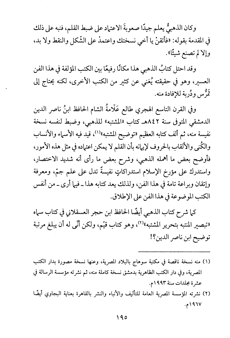 كما شرح كتاب الذهبي أيضًا الحافظ ابن حجر العسقلاني في كتاب سماه "تبصير المنتبه بتحرير المشتبه" (¬2)، وهو كتاب قيّم، ولكن أنّى له أن يبلغ مرتبة توضيح ابن ناصر الدين؟!