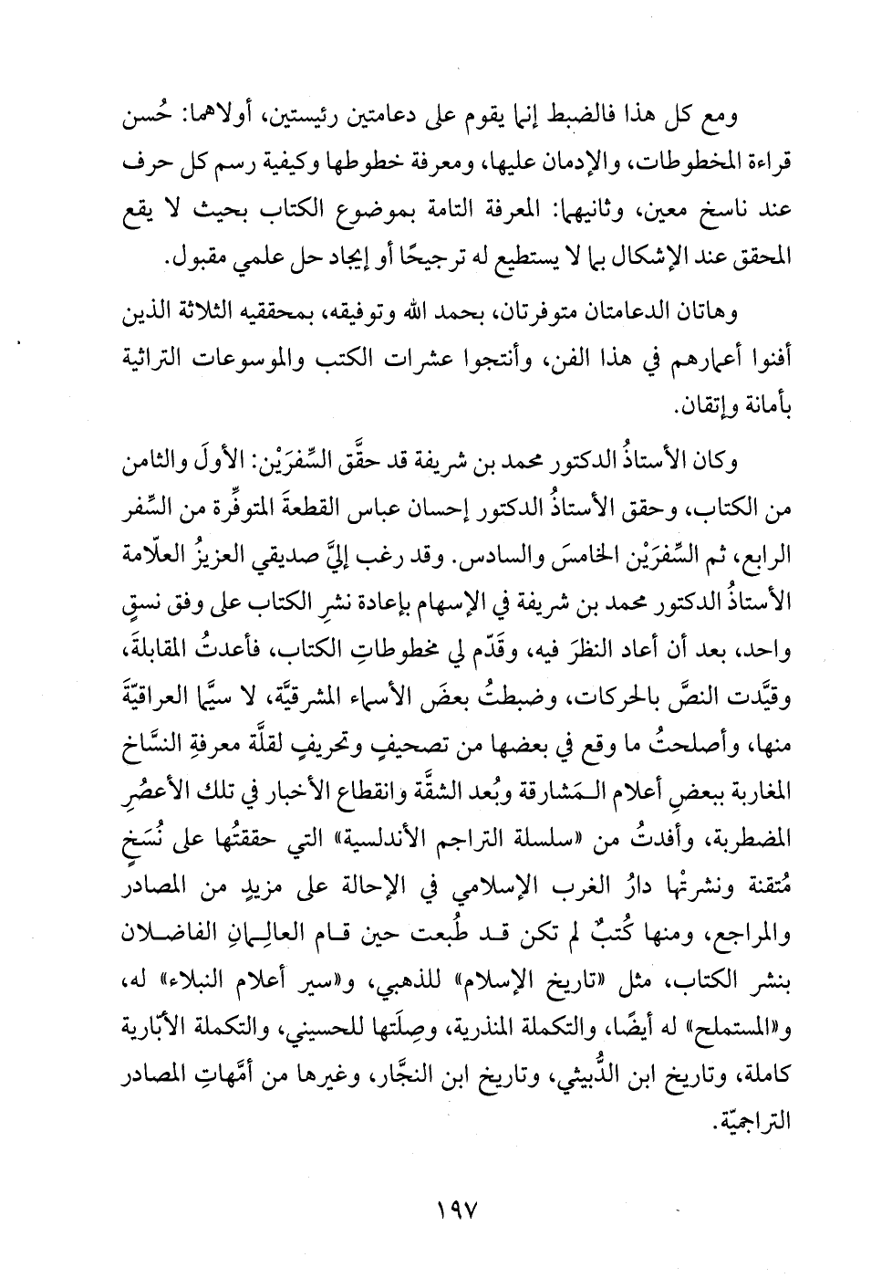وكان الأستاذُ الدكتور محمد بن شريفة قد حقَّق السِّفرَيْن: الأولَ والثامن من الكتاب، وحقق الأستاذُ الدكتور إحسان عباس القطعةَ المتوفِّرة من السِّفر الرابع، ثم السّفرَيْن الخامسَ والسادس. وقد رغب إليَّ صديقي العزيزُ العلّامة الأستاذُ الدكتور محمد بن شريفة في الإسهام بإعادة نشرِ الكتاب على وفق نسقٍ واحد، بعد أن أعاد النظرَ فيه، وقَدّم لي مخطوطاتِ الكتاب، فأعدتُ المقابلةَ، وقيَّدت النصَّ بالحركات، وضبطتُ بعضَ الأسماء المشرقية، لا سيَّما العراقيّةَ منها، وأصلحتُ ما وقع في بعضها من تصحيفٍ وتحريفٍ لقلَّة معرفةِ النسَّاخ المغاربة ببعضِ أعلام المَشارقة وبُعد الشقَّة وانقطاع الأخبار في تلك الأعصُرِ المضطربة، وأفدتُ من "سلسلة التراجم الأندلسية" التي حققتُها على نُسَخٍ مُتقنة ونشرتْها دارُ الغرب الإسلامي في الإحالة على مزيدٍ من المصادر والمراجع، ومنها كُتبٌ لم تكن قد طُبعت حين قام العالِمانِ الفاضلان بنشر الكتاب، مثل "تاريخ الإسلام" للذهبي، و"سير أعلام النبلاء" له، و"المستملح" له أيضًا، والتكملة المنذرية، وصِلَتها للحسيني، والتكملة الأبّارية كاملة، وتاريخ ابن الدُّبيثي، وتاريخ ابن النجَّار، وغيرها من أمَّهاتِ المصادر التراجميّة.
