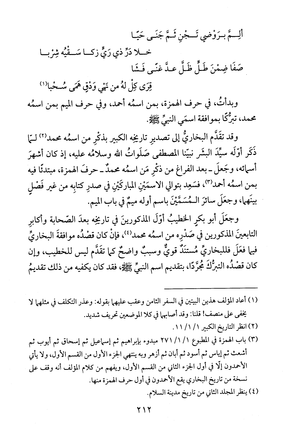 وبدأتُ، في حرف الهمزة، بمن اسمُه أحمد، وفي حرف الميم بمن اسمُه محمد، تبرُّكًا بموافقة اسمَي النبيِّ - صلى الله عليه وسلم -.