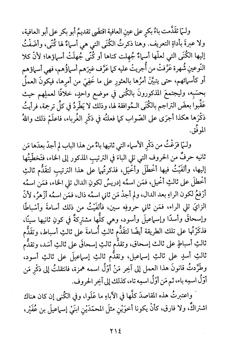 ولمّا فرَغْتُ من ذكْرِ الأسماء التي ثانيها باءٌ من هذا الباب لم أجدْ بعدَها مَن ثانيه حرفٌ من الحروف التي تلي الباءَ في الترتيبِ المذكور إلى الخاء، فتَخطّيتُها إليها، وألفَيْتُ فيها أخْطَلَ وأخْيَل، فذكرتُهما على هذا الترتيبِ لتقَدُّم ثالثِ أخْطلَ على ثالثِ أخْيل، فمَن اسمُه إدريسُ لكونِ الدال تلي الخاء، فمَن اسمُه أزفعُ لكون الراءِ بعد الدال، ولم أجدْ مَن ثاني اسمُه ذال، فمَن اسمُه أزْهرُ، لأنّ الزايَ تلي الراء، فمَن ثاني حروفِه سين، فألفَيْتُ من ذلك أسامةَ وأسْباطًا وإسحاقَ وأسدًا وإسماعيلَ وأسود، وهي كلُّها مشترِكةٌ في كونِ ثانيها سينًا، فذكرتُها على تلك الطريقة أيضًا لتقَدُّم ثالثِ أُسامةَ على ثالثِ أسباط، وتقَدُّم ثالثِ أسباط على ثالث إسحاق، وتقدُّم ثالثِ إسحاقَ على ثالثِ أسَد، وتقدُّم ثالثِ أسدٍ على ثالثِ إسماعيل، وتقدُّم ثالثِ إسماعيلَ على ثالثِ أسود، وطَرَّدتُ قانونَ هذا العمل إلى اَخِر مَنْ أوّلُ اسمه همزة، فانتقلتُ إلى ذكْرِ مَن أوّلُ اسمِه باء، ثم مَن أوّلُ اسمِه تاء، كذلك إلى آخِر الحروف.