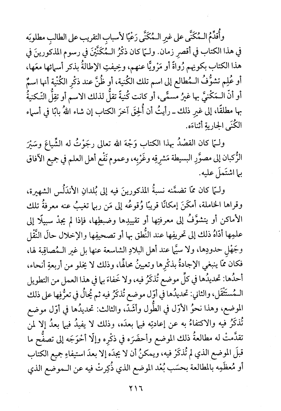 وأُقدِّمُ المُكَنَّى على غيرِ المُكَنَّى رَعْيًا لأسبابِ التقريب على الطالبِ مطلوبَه في هذا الكتاب في أقصرِ زمان. ولمّا كان ذكْرُ المُكَنَّيْنَ في رسوم المذكورينَ في هذا الكتاب بكونِهم رُواةً أو مرويًّا عنهم، وخِيفتِ الإطالةُ بذكر أسمائها معَها، أو عُلِم تشوُّفُ المُطالع إلى اسم تلك الكُنية، أو ظُنَّ عند ذكْرِ الكُنْية أنها اسمٌ أو أنّ المَكْنيَّ بها غيرُ مسمًّى، أو كانت كُنيةً تقلُّ لذلك الاسم أو تقِلُّ التّكنيةُ بها مطلقًا، إلى غير ذلك -رأيتُ أن أُلحِقَ آخرَ الكتاب إن شاء اللهُ بابًا في أسماء الكُنَى الجاريةِ أثناءَه.