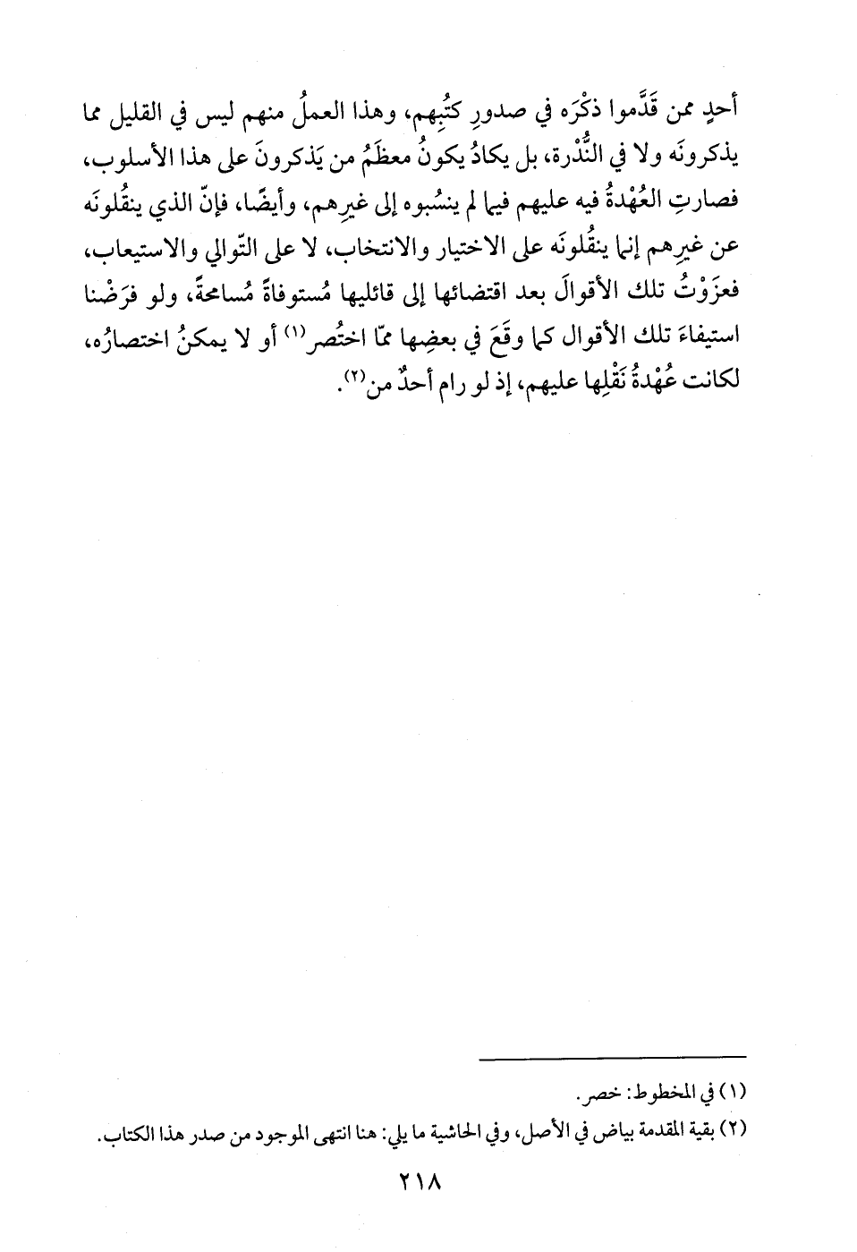أحدٍ ممن قَدَّموا ذكْرَه في صدورِ كتُبِهم، وهذا العملُ منهم ليس في القليل مما يذكرونَه ولا في النُّدْرة، بل يكادُ يكونُ معظَمُ من يَذكرونَ على هذا الأسلوب، فصارتِ العُهْدةُ فيه عليهم فيما لم ينسُبوه إلى غييرهم، وأيضًا، فإنّ الذي ينقُلونَه عن غيرهم إنما ينقُلونَه على الاختيار والانتخاب، لا على التّوالي والاستيعاب، فعزَوْتُ تلك الأقوالَ بعد اقتضائها إلى قائليها مُستوفاةً مُسامحةً، ولو فرَضْنا استيفاءَ تلك الأقوال كما وقَعَ في بعضِها ممّا اختُصر (¬1) أو لا يمكنُ اختصارُه، لكانت عُهْدةُ نَقْلِها عليهم، إذ لو رام أحدٌ من (¬2).