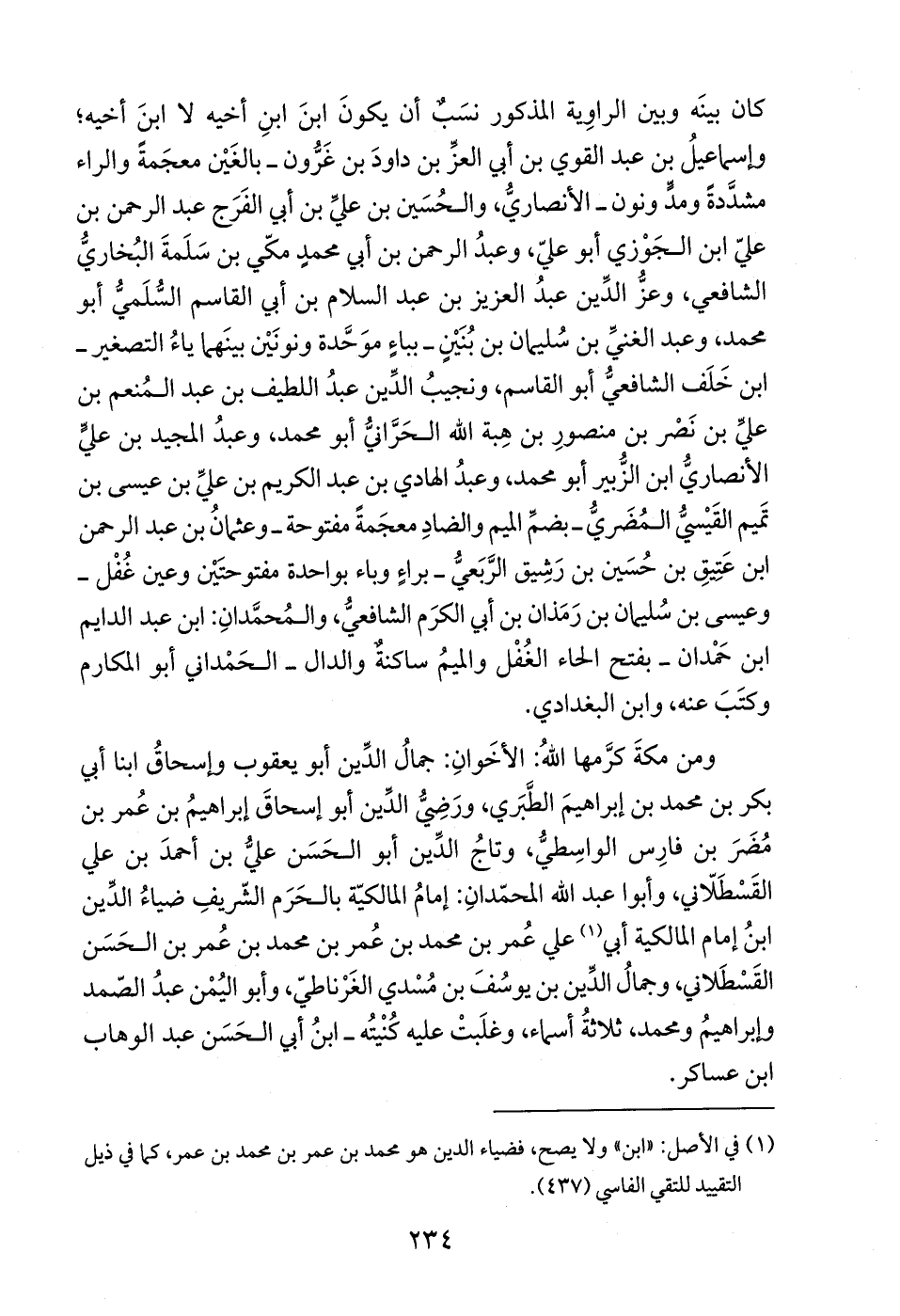 كان بينَه وبين الراوِية المذكور نسَبٌ أن يكونَ ابنَ ابنِ أخيه لا ابنَ أخيه؛ وإسماعيلُ بن عبد القوي بن أبي العزِّ بن داودَ بن غَرُّون -بالغَيْن معجَمةً والراء مشدَّدةً ومدٍّ ونون- الأنصاريُّ، والحُسَين بن عليِّ بن أبي الفَرَج عبد الرحمن بن عليّ ابن الجَوْزي أبو عليّ، وعبدُ الرحمن بن أبي محمدِ مكّي بن سَلَمةَ البُخاريُّ الشافعي، وعزُّ الدِّين عبدُ العزيز بن عبد السلام بن أبي القاسم السُّلَميُّ أبو محمد، وعبد الغنيِّ بن سُليمان بن بُنَيْنٍ -بباءٍ موَحَّدة ونونَيْن بينَهما ياءُ التصغير- ابن خَلَف الشافعيُّ أبو القاسم، ونجيبُ الدِّين عبدُ اللطيف بن عبد المُنعم بن عليِّ بن نَصْر بن منصورِ بن هِبة الله الحَرَّانيُّ أبو محمد، وعبدُ المجيد بن عليٍّ الأنصاريُّ ابن الزُّبير أبو محمد، وعبدُ الهادي بن عبد الكريم بن عليِّ بن عيسى بن تمَيم القَيْسيُّ المُضَريُّ -بضمِّ الميم والضادِ معجَمةً مفتوحة- وعثمانُ بن عبد الرحمن ابن عَتِيقِ بن حُسَين بن رَشِيق الرَّبَعيُّ- براءٍ وباء بواحدة مفتوحتَيْن وعين غُفْل- وعيسى بن سُليمان بن رَمَذان بن أبي الكرَم الشافعيُّ، والمُحمَّدانِ: ابن عبد الدايم ابن حَمدان- بفتح الحاء الغُفْل والميمُ ساكنةٌ والدال- الحَمداني أبو المكارم وكتَبَ عنه، وابن البغدادي.