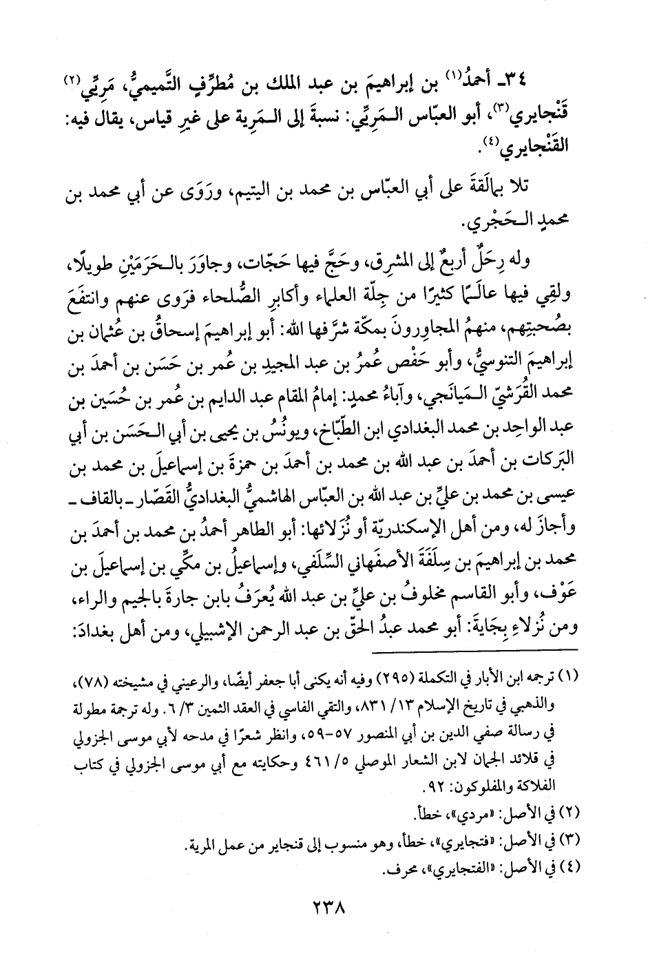 34 - أحمدُ (¬1) بن إبراهيمَ بن عبد الملك بن مُطرِّفٍ التَّميميُّ، مَرِيِّي (¬2) قَنْجايري (¬3)، أبو العبّاس المَرِيِّي: نسبةَ إلى المَرِية على غيرِ قياس، يقال فيه: القَنْجايري (¬4).