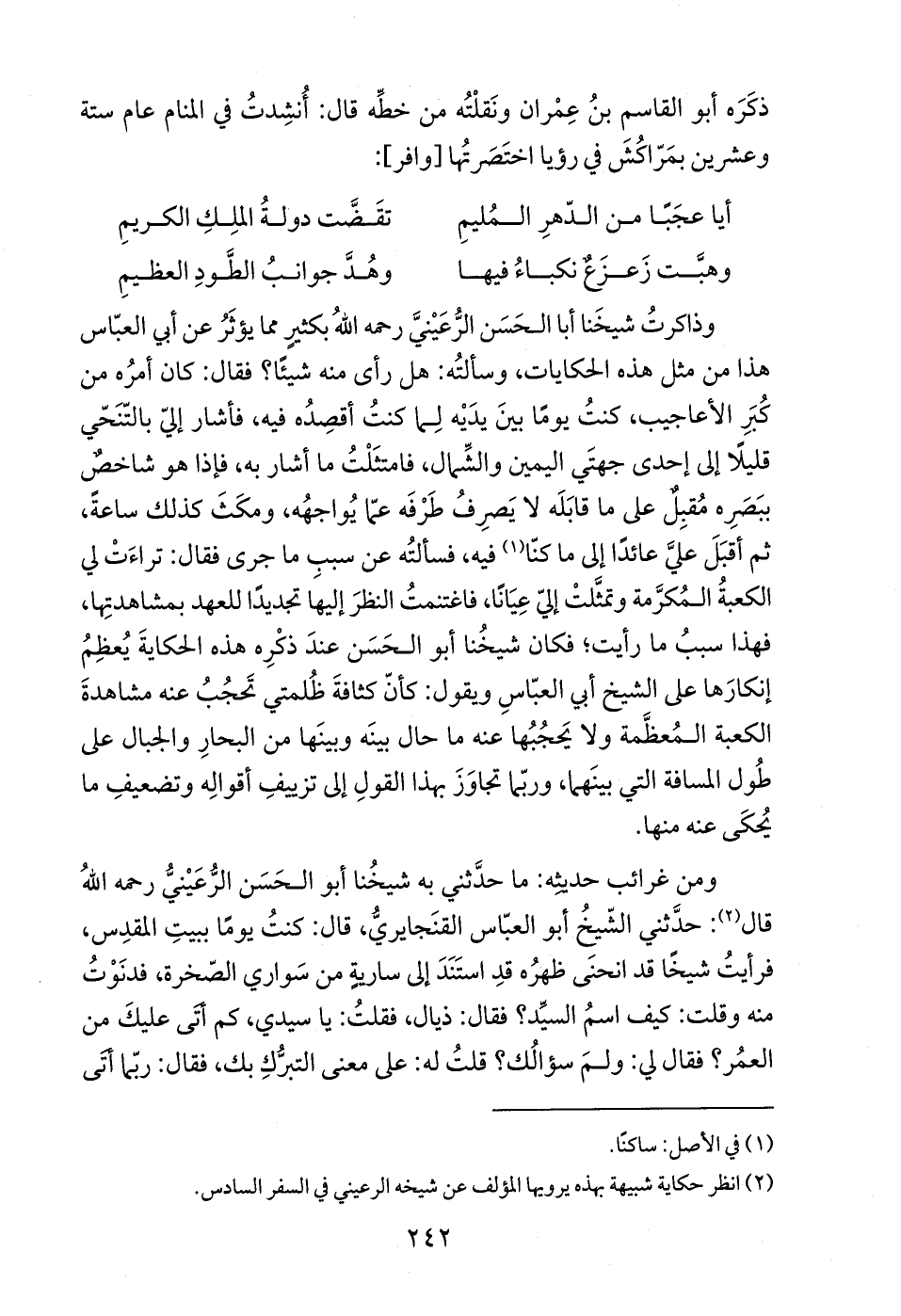 وذاكرتُ شيخَنا أبا الحَسَن الرُّعَيْنيَّ رحمه اللهُ بكثيرٍ مما يؤثَرُ عن أبي العبّاس هذا من مثل هذه الحكايات، وسألتُه: هل رأى منه شيئًا؟ فقال: كان أمرُه من كُبَرِ الأعاجيب، كنتُ يومًا بينَ يدَيْه لِما كنتُ أقصِدُه فيه، فأشار إليّ بالتّنَحّي قليلًا إلى إحدى جهتَي اليمين والشِّمال، فامتثَلْتُ ما أشار به، فإذا هو شاخصٌ ببَصَرِه مُقبِلٌ على ما قابَلَه لا يَصرِفُ طَرفَه عمّا يُواجهُه، ومكَثَ كذلك ساعةً، ثم أقبَلَ عليَّ عائدًا إلى ما كنّا (¬1) فيه، فسألتُه عن سببِ ما جرى فقال: تراءَتْ لي الكعبةُ المُكرَّمة وتمثَّلتْ إليّ عِيَانًا، فاغتنمتُ النظرَ إليها تجديدًا للعهد بمشاهدتِها، فهذا سببُ ما رأيت؛ فكان شيخُنا أبو الحَسَن عندَ ذكْرِه هذه الحكايةَ يُعظِمُ إنكارَها على الشيخ أبي العبّاسِ ويقول: كأنّ كثافةَ ظُلمتي تَحجُبُ عنه مشاهدةَ الكعبة المُعظَّمة ولا يَحجُبُها عنه ما حال بينَه وبينَها من البحارِ والجبال على طُول المسافة التي بينَهما، وربّما تجاوَزَ بهذا القولِ إلى تزييفِ أقوالِه وتضعيفِ ما يُحكَى عنه منها.
