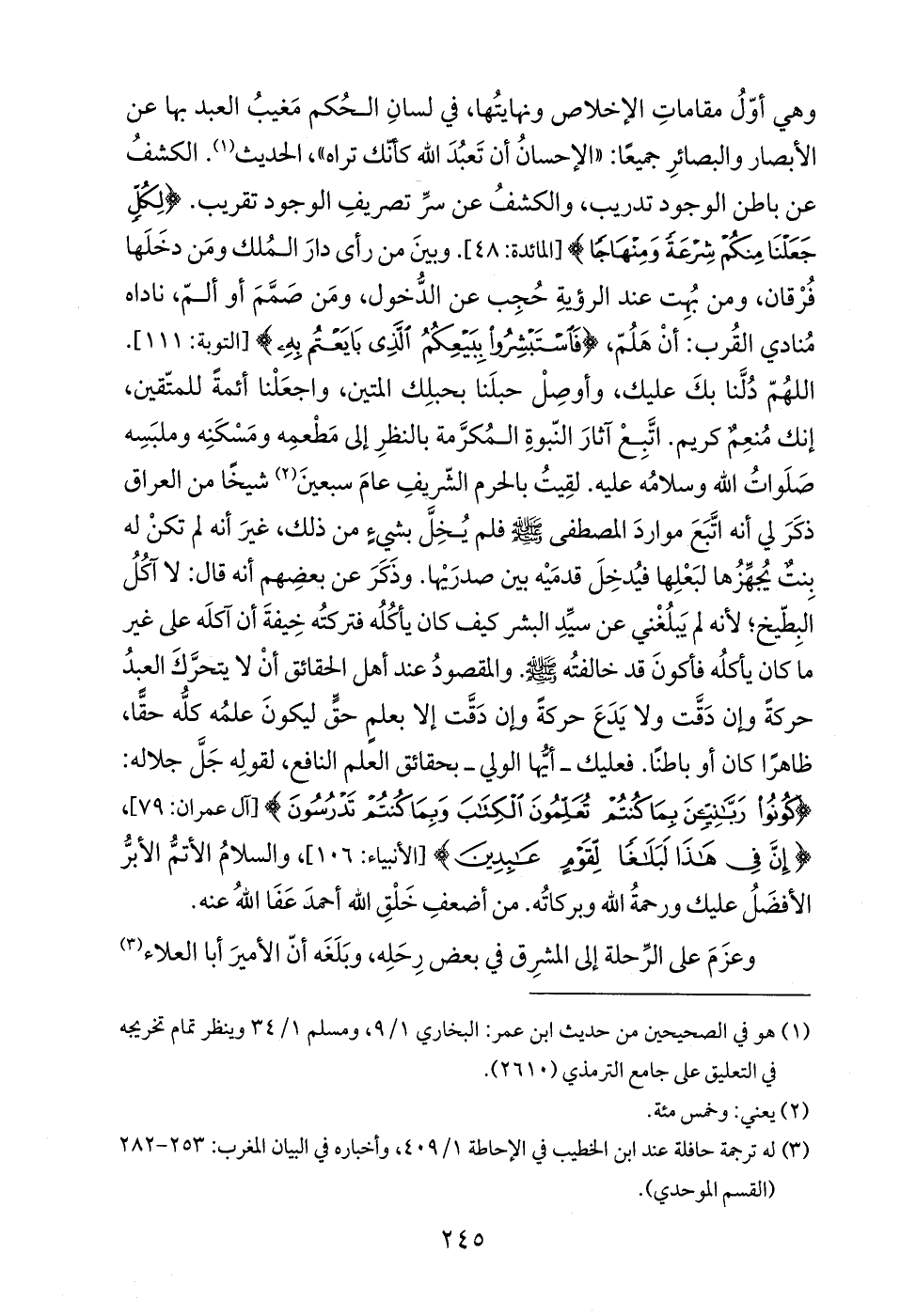 وهي أوّلُ مقاماتِ الإخلاص ونهايتُها، في لسانِ الحُكم مَغيبُ العبد بها عن الأبصار والبصائرِ جميعًا: "الإحسانُ أن تَعبُدَ الله كأنّك تراه"، الحديث (¬1). الكشفُ عن باطن الوجود تدريب، والكشفُ عن سرِّ تصريفِ الوجود تقريب. {لِكُلٍّ جَعَلْنَا مِنْكُمْ شِرْعَةً وَمِنْهَاجًا} [المائدة: 48]. وبينَ من رأى دارَ المُلك ومَن دخَلَها فُزقان، ومن بُهِت عند الرؤيةِ حُجِب عن الدُّخول، ومَن صَمَّمَ أو ألمّ، ناداه مُنادي القُرب: أنْ هلُمّ، {فَاسْتَبْشِرُوا بِبَيْعِكُمُ الَّذِي بَايَعْتُمْ بِهِ} [التوبة: 111]. اللهُمّ دُلَّنا بكَ عليك، وأوصِلْ حبلَنا بحبلِك المتين، واجعَلْنا أئمةً للمتّقين، إنك مُنعِمٌ كريم. اتَّبِع آثارَ النّبوةِ المُكرَّمة بالنظرِ إلى مَطْعمِه ومَسْكَنِه وملبَسِه صَلَواتُ الله وسلامُه عليه. لقِيتُ بالحرم الشّريف عامَ سبعينَ (¬2) شيخًا من العراق ذكَرَ في أنه اتَّبَعَ مواردَ المصطفى - صلى الله عليه وسلم - فلم يُخِلَّ بشيءٍ من ذلك، غيرَ أنه لم تكنْ له بِنتٌ يُجهِّزُها لبَعْلِها فيُدخِلَ قدمَيْه بين صدرَيْها. وذَكَرَ عن بعضِهم أنه قال: لا آكُلُ البِطّيخ؛ لأنه لم يَبلُغْني عن سيِّدِ البشر كيف كان يأكُلُه فتركتُه خِيفةَ أن آكلَه على غير ما كان يأكلُه فاكونَ قد خالفتُه - صلى الله عليه وسلم -. والمقصودُ عند أهل الحقائق أنْ لا يتحرَّكَ العبدُ حركةً وإن دَقَّت ولا يَدَعَ حركةً وإن دَقَّت إلا بعلمٍ حقٍّ ليكونَ علمُه كلُّه حقًّا، ظاهرًا كان أو باطنًا. فعليك -أيُّها الولي- بحقائق العلم النافع، لقولِه جَلَّ جلاله: {كُونُوا رَبَّانِيِّينَ بِمَا كُنْتُمْ تُعَلِّمُونَ الْكِتَابَ وَبِمَا كُنْتُمْ تَدْرُسُونَ} [آل عمران: 79]، {إِنَّ فِي هَذَا لَبَلَاغًا لِقَوْمٍ عَابِدِينَ} [الأنبياء: 106]، والسلامُ الأتمُّ الأبرُّ الأفضَلُ عليك ورحمةُ الله وبركاتُه. من أضعفِ خَلْقِ الله أحمدَ عَفَا اللهُ عنه.
