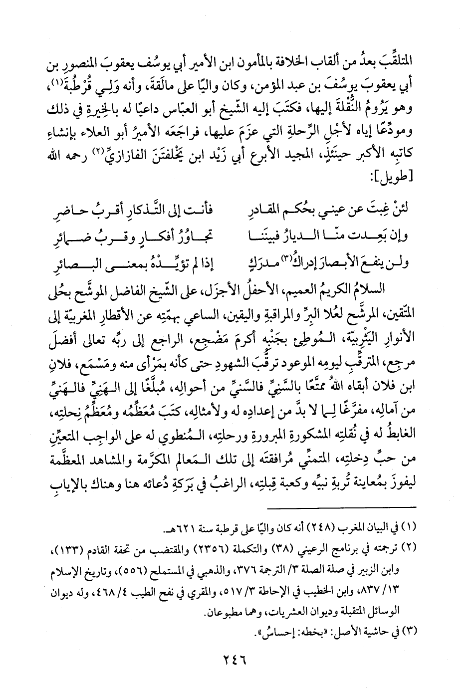 المتلقّبَ بعدُ من ألقاب الخلافة بالمأمون ابن الأمير أبي يوسُف يعقوبَ المنصورِ بن أبي يعقوبَ يوسُفَ بن عبد المؤمن، وكان واليًا على مالَقةَ، وأنه وَلِي قُرْطُبةَ (¬1)، وهو يَرُومُ النّقلةَ إليها، فكتَبَ إليه الشّيخ أبو العبّاس داعيًا له بالخِيرة في ذلك ومودِّعًا إياه لأجْلِ الرِّحلةِ التي عزَمَ عليها، فراجَعَه الأميرُ أبو العلاء بإنشاءِ كاتبِه الأكبر حينَئذٍ، المجيد الأبرع أبي زَيْد ابن يَخْلفتَنَ الفازازيِّ (¬2) رحمه الله [طويل]: