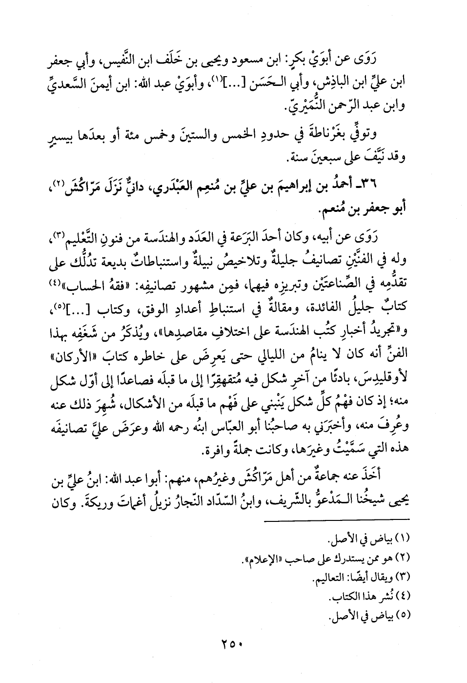 رَوَى عن أبيه، وكان أحدَ البَرَعة في العَدَد والهندَسة من فنونِ التّعْليم (¬3)، وله في الفنَّيْنِ تصانيفُ جليلةٌ وتلاخيصُ نبيلةٌ واستنباطاتٌ بديعة تدُلُّك على تقدُّمِه في الصِّناعتَيْن وتبريزِه فيهما، فمِن مشهور تصانيفِه: "فقهُ الحساب" (¬4) كتابٌ جليلُ الفائدة، ومقالةٌ في استنباطِ أعدادِ الوفق، وكتاب [.......] (¬5)، و"تجريدُ أخبارِ كتُب الهندَسة على اختلافِ مقاصدِها"، ويُذكَرُ من شَغَفِه بهذا الفنِّ أنه كان لا ينامُ من الليالي حتى يَعرِضَ على خاطره كتابَ "الأركان" لأوقليدِسَ، بادئًا من آخرِ شكل فيه مُتقهقِرًا إلى ما قبلَه فصاعدًا إلى أوّل شكل منه؛ إذ كان فهْمُ كلِّ شكل يَنْبني على فَهْم ما قبلَه من الأشكال، شُهِرَ ذلك عنه وعُرِفَ منه، وأخبَرَني به صاحبُنا أبو العبّاس ابنُه رحمه الله وعرَضَ عليَّ تصانيفَه هذه التىِ سَمَّيْتُ وغيرَها، وكانت جملةً وافرة.