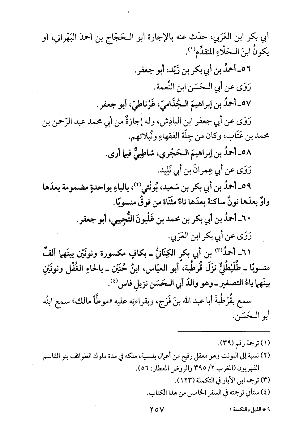 61 - أحمدُ (¬3) بن أبي بكر الكِنَانيُّ -بكاف مكسورة ونونَيْن بينَهما ألفٌ منسوبًا- طُلَيْطُليٌّ نزَلَ قُرطُبة، أبو العبّاس، ابنُ حُنَيْن- بالحاءِ الغُفْل ونونَيْنِ بينَهما ياءُ التصغير- وهو والدُ أبي الحَسَن نزيلِ فاس (¬4).