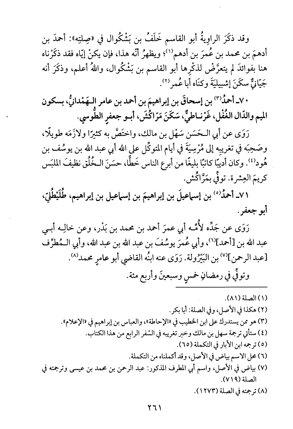 70 - أحمدُ (¬3) بن إسحاقَ بن إبراهيمَ بن أحمد بن عامر الهمدانيُّ، بسكون الميم والدّال الغُفْل، غَرْناطيٌّ، سَكَنَ مَرّاكشَ، أبو جعفرٍ الطُّوسي.
