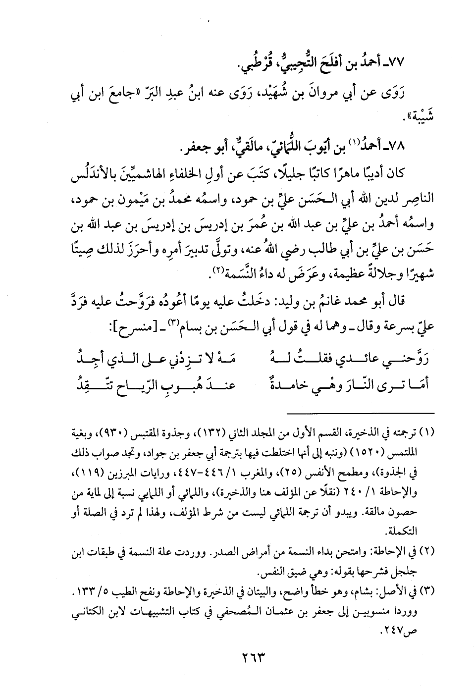 (¬3) في الأصل: بشام، وهو خطأ واضح، والبيتان في الذخيرة والإحاطة ونفح الطيب 5/ 133. ووردا منسوبين إلى جعفر بن عثمان المُصحفي في كتاب التشبيهات لابن الكتاني ص 247.