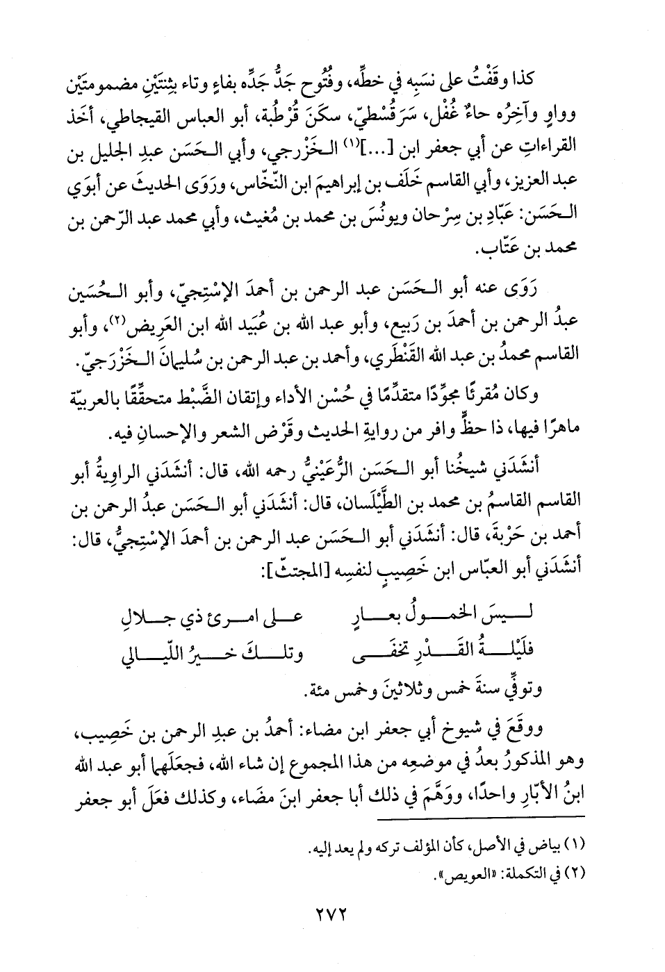 ووقَعَ في شيوخ أبي جعفر ابن مضاء: أحمدُ بن عبدِ الرحمن بن خَصيب، وهو المذكورُ بعدُ في موضعه من هذا المجموع إن شاء الله، فجعَلَهما أبو عبد الله ابنُ الأبّارِ واحدًا، ووَهَّمَ في ذلك أبا جعفر ابنَ مضَاء، وكذلك فعَلَ أبو جعفر