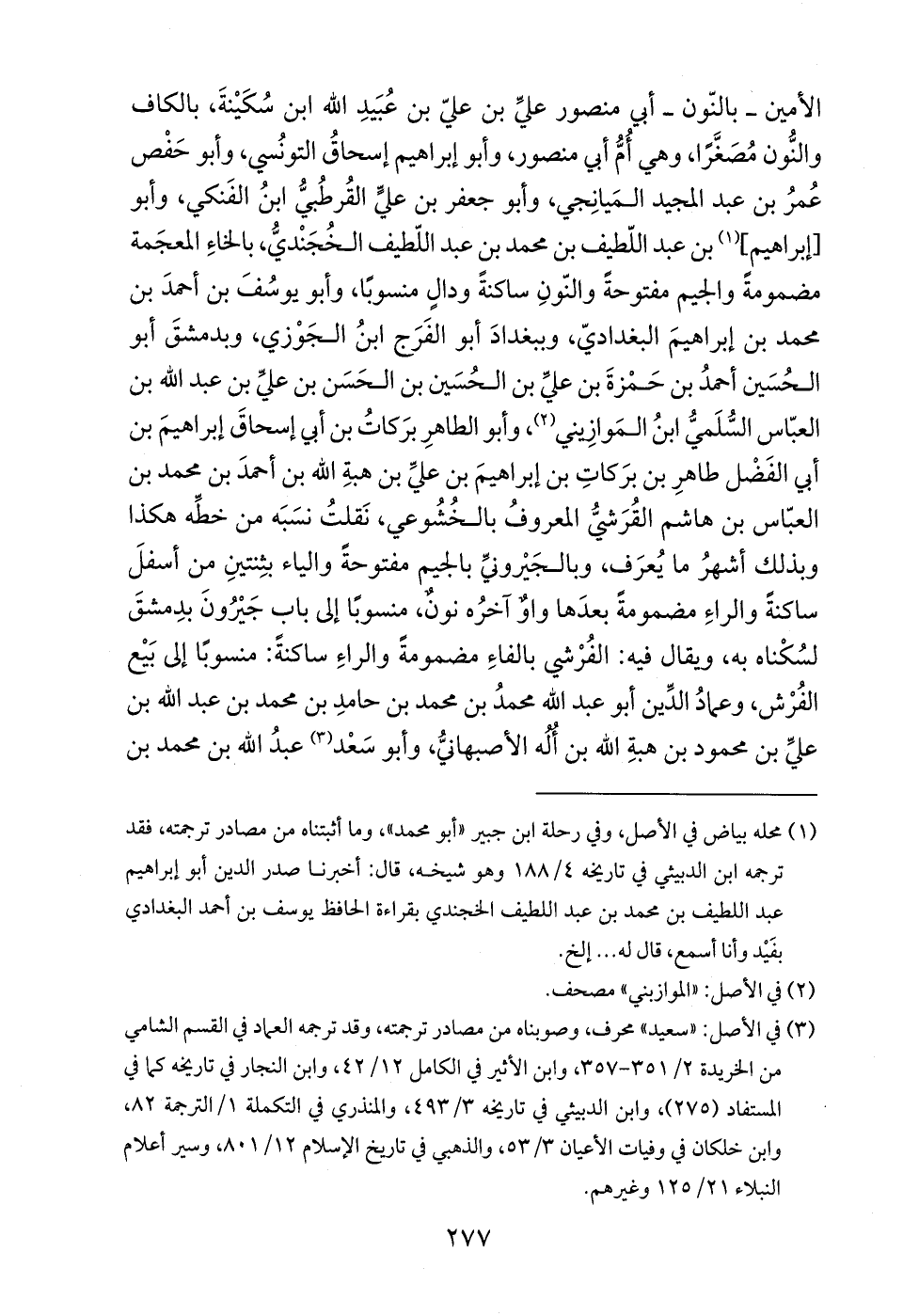 الأمين -بالنّون- أبي منصور عليِّ بن عليّ بن عُبَيدِ الله ابن سُكَيْنةَ، بالكاف والنُّون مُصغَّرًا، وهي أُمُّ أبي منصور، وأبو إبراهيم إسحاقُ التونُسي، وأبو حَفْص عُمرُ بن عبد المجيد المَيانِجي، وأبو جعفر بن عليٍّ القُرطُبيُّ ابنُ الفَنكي، وأبو [إبراهيم] (¬1) بن عبد اللّطيف بن محمد بن عبد اللّطيف الخُجَنْديُّ، بالخاءِ المعجَمة مضمومةً والجيم مفتوحةً والنّونِ ساكنةً ودالٍ منسوبًا، وأبو يوسُفَ بن أحمدَ بن محمد بن إبراهيمَ البغداديّ، وببغدادَ أبو الفَرَج ابنُ الجَوْزي، وبدمشقَ أبو الحُسَين أحمدُ بن حمزةَ بن عليِّ بن الحُسَين بن الحَسَن بن عليِّ بن عبد الله بن العبّاس السُّلَميُّ ابنُ المَوازِيني (¬2)، وأبو الطاهرِ برَكاتُ بن أبي إسحاقَ إبراهيمَ بن أبي الفَضْل طاهرِ بن برَكاتِ بن إبراهيمَ بن عليِّ بن هبةِ الله بن أحمدَ بن محمد بن العبّاس بن هاشم القُرَشيُّ المعروفُ بالخُشُوعي، نَقلتُ نسَبَه من خطِّه هكذا وبذلك أشهرُ ما يُعرَف، وبالجَيْرونيِّ بالجيم مفتوحةً والياء بثِنتينِ من أسفلَ ساكنةً والراءِ مضمومةً بعدَها واوٌ آخرُه نونٌ، منسوبًا إلى باب جَيْرُونَ بدِمشقَ لسُكْناه به، ويقال فيه: الفُرشي بالفاءِ مضمومةً والراءِ ساكنةً: منسوبًا إلى بَيْع الفُرش، وعمادُ الدِّين أبو عبد الله محمدُ بن محمد بن حامدِ بن محمد بن عبد الله بن عليِّ بن محمود بن هبةِ الله بن أُلُه الأصبهانيُّ، وأبو سَعد (¬3) عبدُ الله بن محمد بن