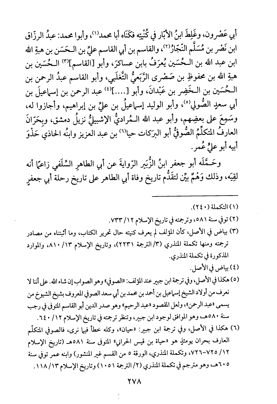 (¬5) هكذا في الأصل، وفي ترجمة ابن جبير عند المؤلف: "الصوفي" وهو الصواب إن شاء الله. على أننا لا نعرف من أولاد الشيخ إسماعيل بن أحمد بن محمد بن أبي سعد الصوفي المعروف بشيخ الشيوخ من يسمى "عبد الرحمن"، ولعل المقصود "عبد الرحيم" لما وهو صدر الدين أبو القاسم المتوفى في رجب سنة 580 هـ، وهو الموافق لوجود ابن جبير، وتنظر ترجمته في تاريخ الإسلام 12/ 640.