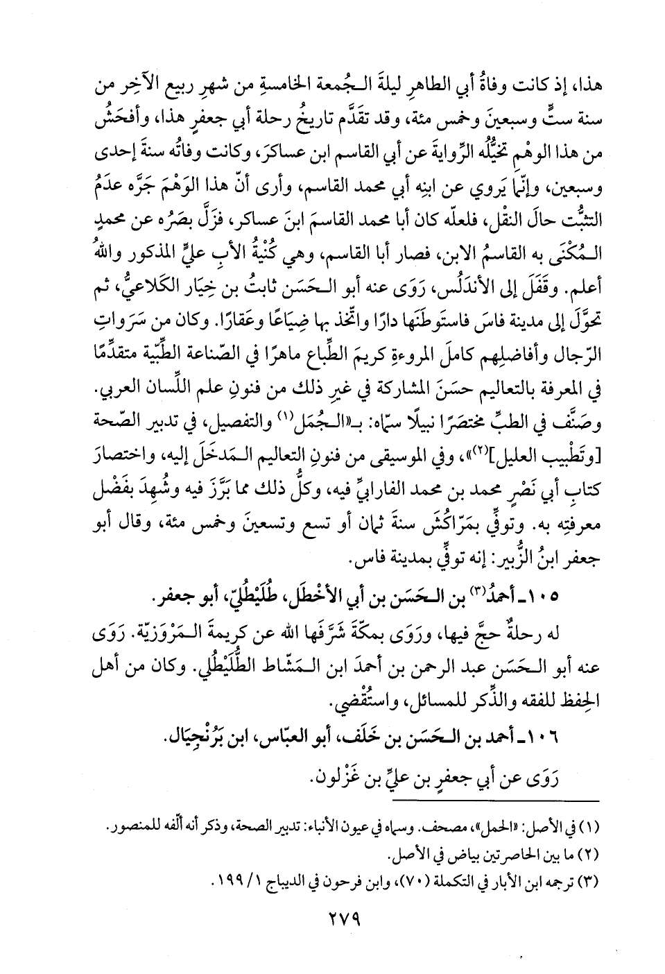 هذا، إذ كانت وفاةُ أبي الطاهرِ ليلةَ الجُمعة الخامسةِ من شهرِ ربيع الآخِر من سنة ستّ وسبعينَ وخمس مئة، وقد تقَدَّم تاريخُ رحلة أبي جعفرِ هذا، وأفحَشُ من هذا الوهْمِ تخيُّلُه الرِّوايةَ عن أبي القاسم ابن عساكرَ، وكانت وفاتُه سنةَ إحدى وسبعين، وإنّما يَروي عن ابنِه أبي محمد القاسم، وأرى أنّ هذا الوَهْمَ جَرَّه عدَمُ التثبُّت حالَ النقْل، فلعلّه كان أبا محمد القاسمَ ابنَ عساكر، فزَلَّ بصَره عن محمدٍ المُكْنَى به القاسمُ الابن، فصار أبا القاسم، وهي كُنْيةُ الأبِ عليٍّ المذكور واللهُ أعلم. وقَفَلَ إلى الأندَلُس، رَوَى عنه أبو الحَسَن ثابتُ بن خِيَار الكَلاعيُّ، ثم تحوَّلَ إلى مدينة فاسَ فاستَوطَنَها دارًا واتّخذ بها ضِيَاعًا وعَقارًا. وكان من سَرَواتِ الرّجال وأفاضلِهم كاملَ المروءةِ كريمَ الطِّباع ماهرًا في الصّناعة الطِّبّية متقدِّماً في المعرفة بالتعاليم حسَنَ المشاركة في غير ذلك من فنونِ علم اللِّسان العربي. وصَنَّف في الطبِّ مختصَرًا نبيلًا سمّاه: بـ "الجُمَل (¬1) والتفصيل، في تدبير الصّحة [وتَطْبيب العليل] (¬2) "، وفي الموسيقى من فنونِ التعاليم المَدخَلَ إليه، واختصارَ كتابِ أبي نَضرٍ محمد بن محمد الفارابيِّ فيه، وكلُّ ذلك مما بَرَّزَ فيه وشُهِدَ بفَضل معرفتِه به. وتوفِّي بمَرّاكُشَ سنةَ ثمان أو تسع وتسعينَ وخمس مئة، وقال أبو جعفر ابنُ الزُّبير: إنه توفِّي بمدينة فاس.