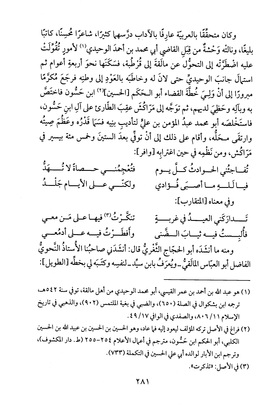وكان متحقّقًا بالعربيّة عارِفًا بالآداب درَّسهما كثيرًا، شاعرًا مُحسِنًا، كاتبًا بليغًا، ونالتْه وَحْشةٌ من قِبَلِ القاضي أبي محمد بن أحمدَ الوحيدي (¬1) لأمورٍ تُقُوِّلَتْ عليه اضْطرّتْه إلى التحوُّل عن مالَقةَ إلى قُرطُبة، فسَكَنَها نحوَ أربعةِ أعوام ثم استمالَ جانبَ الوحيديِّ حتى لانَ له وخاطَبَه بالعَوْدِ إلى وطنِه فرجَعَ مُكرَّمًا مبرورًا إلى أنْ وَليَ خُطَّةَ القضاء أبو الحَكَم [الحسين] (¬2) ابن حَسُّون فاختَصَّ به وبآلِه وحَظِيَ لديهم، ثم توَجَّه إلى مَرّاكُشَ عقِبَ الطّارئ على آلِ ابنِ حَسُّون، فاستَخْلصَه أبو محمد عبدُ المؤمن بن عليٍّ لتأديبِ بنِيه فسَمَا قَدرُه وعَظُمَ صِيتُه وارتقَى محَلُّه، وأقام على ذلك إلى أنْ توفِّي بعدَ الستينَ وخمس مئة بيسير في مَرّاكُش، ومن نَظْمِه في حين اغترابِه [وافر]: