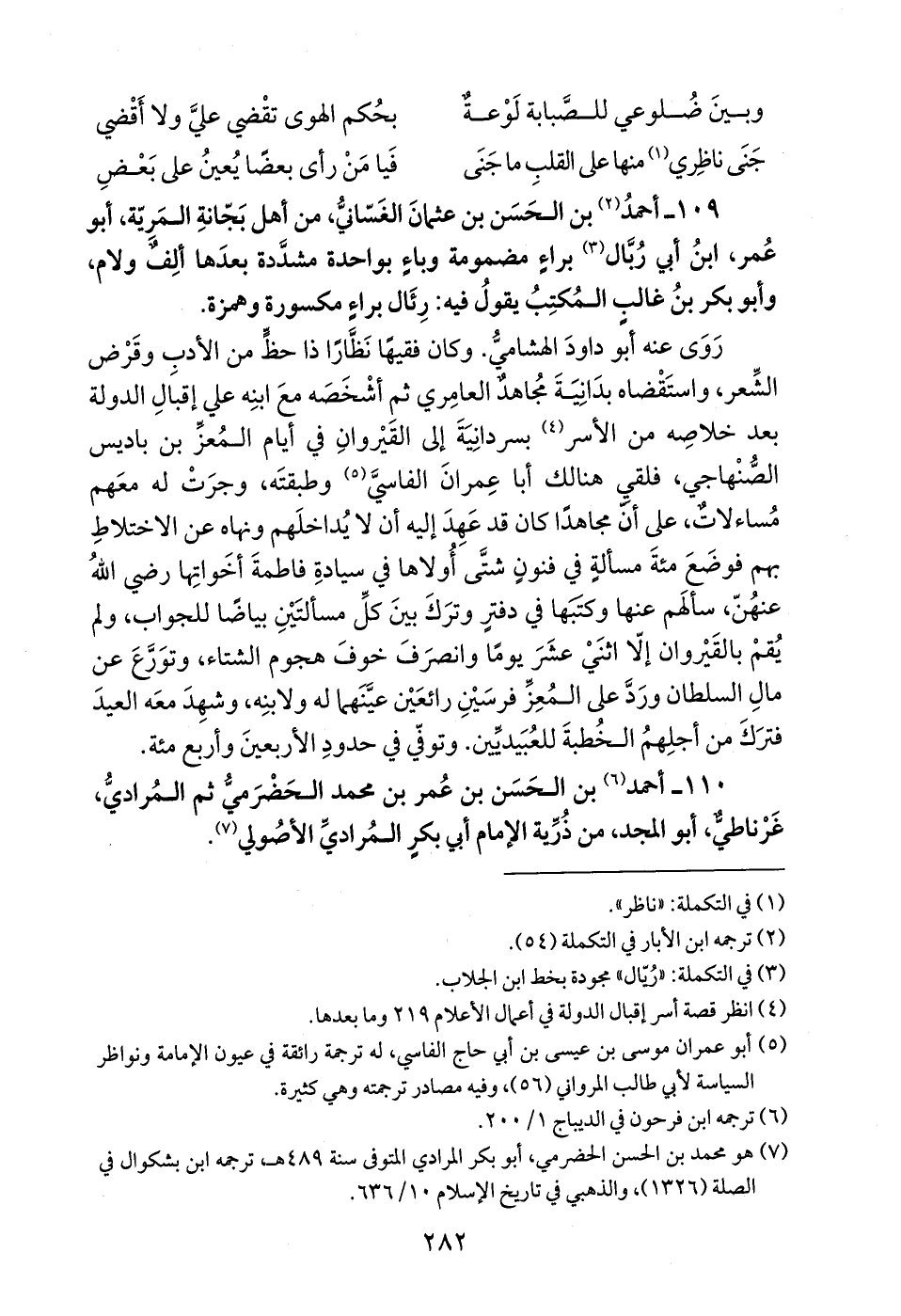 110 - أحمد (¬6) بن الحَسَن بن عُمر بن محمد الحَضْرَميُّ ثم المُراديُّ، غرناطيٌّ، أبو المجد، من ذُرِّية الإمام أبي بكرٍ المُراديِّ الأصُولي (¬7).