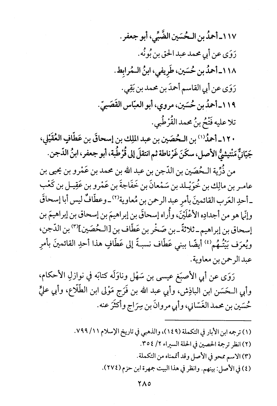 120 - أحمدُ (¬1) بن الحُصَين بن عبد الملِك بن إسحاقَ بن عَطّافٍ العُقَيْلي، جَيّانيٌّ مَنْتيشيُّ الأصل، سكَنَ غَرْناطة ثم انتقلَ إلى قُرطُبة، أبو جعفر، ابنُ الدّجن.