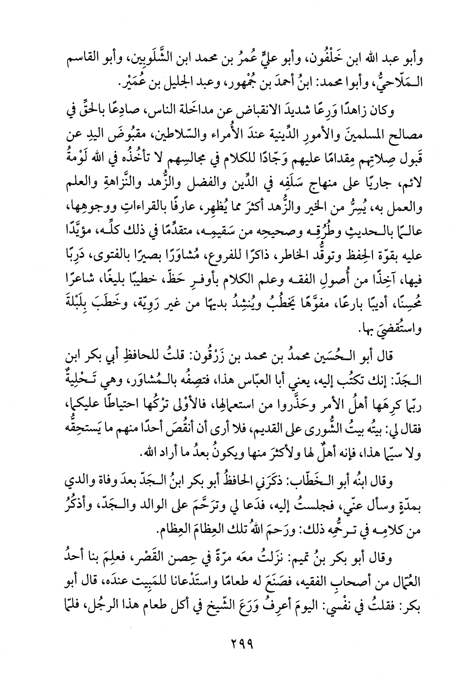 وقال أبو بكر بنُ تميم: نزَلتُ معَه مرّةً في حِصن القَصر، فعلِمَ بنا أحدُ العمال من أصحابِ الفقيه، فصنَعَ له طعامًا واستَدْعانا للمَبِيت عندَه، قال أبو بكر: فقلتُ في نفْسي: اليومَ أعرِفُ وَرَعَ الشّيخ في أكل طعام هذا الرجُل، فلمّا