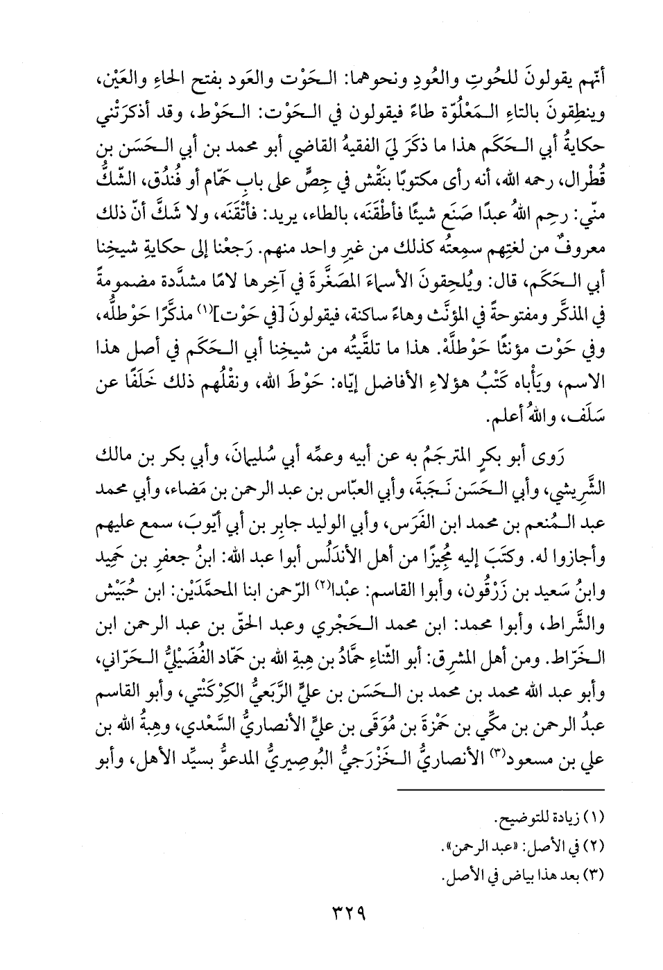 أنّهم يقولونَ للحُوتِ والعُودِ ونحوهما: الحَوْت والعَود بفتح الحاءِ والعَيْن، وينطِقونَ بالتاءِ المَعْلُوّة طاءً فيقولون في الحَوْت: الحَوْط، وقد أذكرَتْني حكايةُ أبي الحَكَم هذا ما ذكَرَ ليَ الفقيهُ القاضي أبو محمد بن أبي الحَسَن بن قُطْرال، رحمه الله، أنه رأى مكتوبًا بنَقْش في جِصٍّ على باب حَمّام أو فُندُق، الشّكُّ منّي: رحِم اللهُ عبدًا صَنَع شيئًا فأطْقَنَه، بالطاء، يريد: فأتقَنَه، ولا شَكَّ أنّ ذلك معروفٌ من لغتِهم سمِعتُه كذلك من غيرِ واحد منهم. رَجعْنا إلى حكايةِ شيخِنا أبي الحَكَم، قال: ويُلحِقونَ الأسماءَ المصَغَّرةَ في آخِرها لامًا مشدَّدة مضمومةً في المذكَّر ومفتوحةً في المؤنَّث وهاءً ساكنة، فيقولونَ [في حَوْت] (¬1) مذكَّرًا حَوْطلُّه، وفي حَوْت مؤنثًا حَوْطلَّهْ. هذا ما تلقَّيتُه من شيخِنا أبي الحَكَم في أصل هذا الاسم، ويَأْباه كَتْبُ هؤلاءِ الأفاضل إيّاه: حَوْطَ الله، ونقْلُهم ذلك خَلَفًا عن سَلَف، واللهُ أعلم.