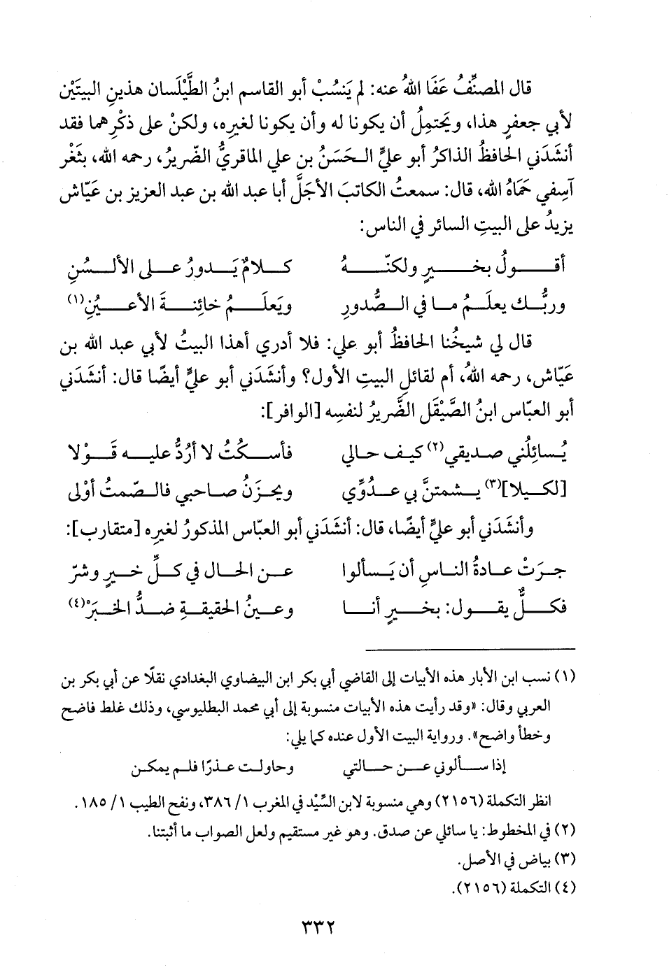 (¬1) نسب ابن الأبّار هذه الأبيات إلى القاضي أبي بكر ابن البيضاوي البغدادي نقلًا عن أبي بكر بن العربي وقال: "وقد رأيت هذه الأبيات منسوبة إلى أبي محمد البطليوسي، وذلك غلط فاضح وخطأ واضح". ورواية البيت الأول عنده كما يلي: