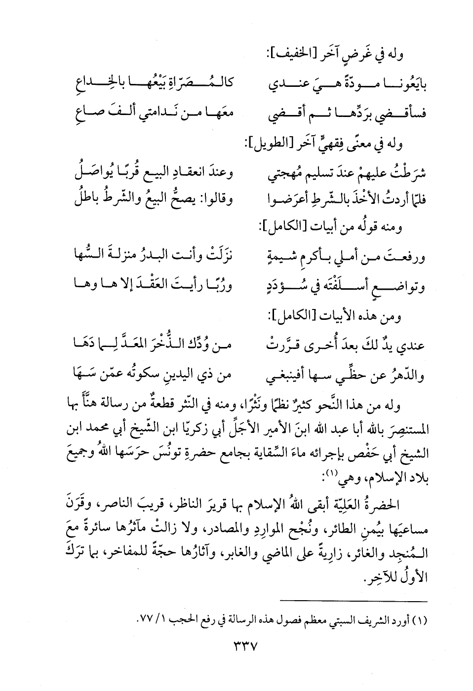 وله من هذا النَّحو كثيرٌ نظمًا ونَثْرًا، ومنه في النّثر قطعةٌ من رسالة هنَّأَ بها المستنصِرَ بالله أبا عبد الله ابنَ الأمير الأجَلِّ أبي زكريّا ابن الشّيخ أبي محمد ابن الشيخ أبي حَفْص بإجرائه ماءَ السِّقاية بجامع حضرةِ تونُسَ حرَسَها اللهُ وجميعَ بلاد الإسلام، وهي (¬1):