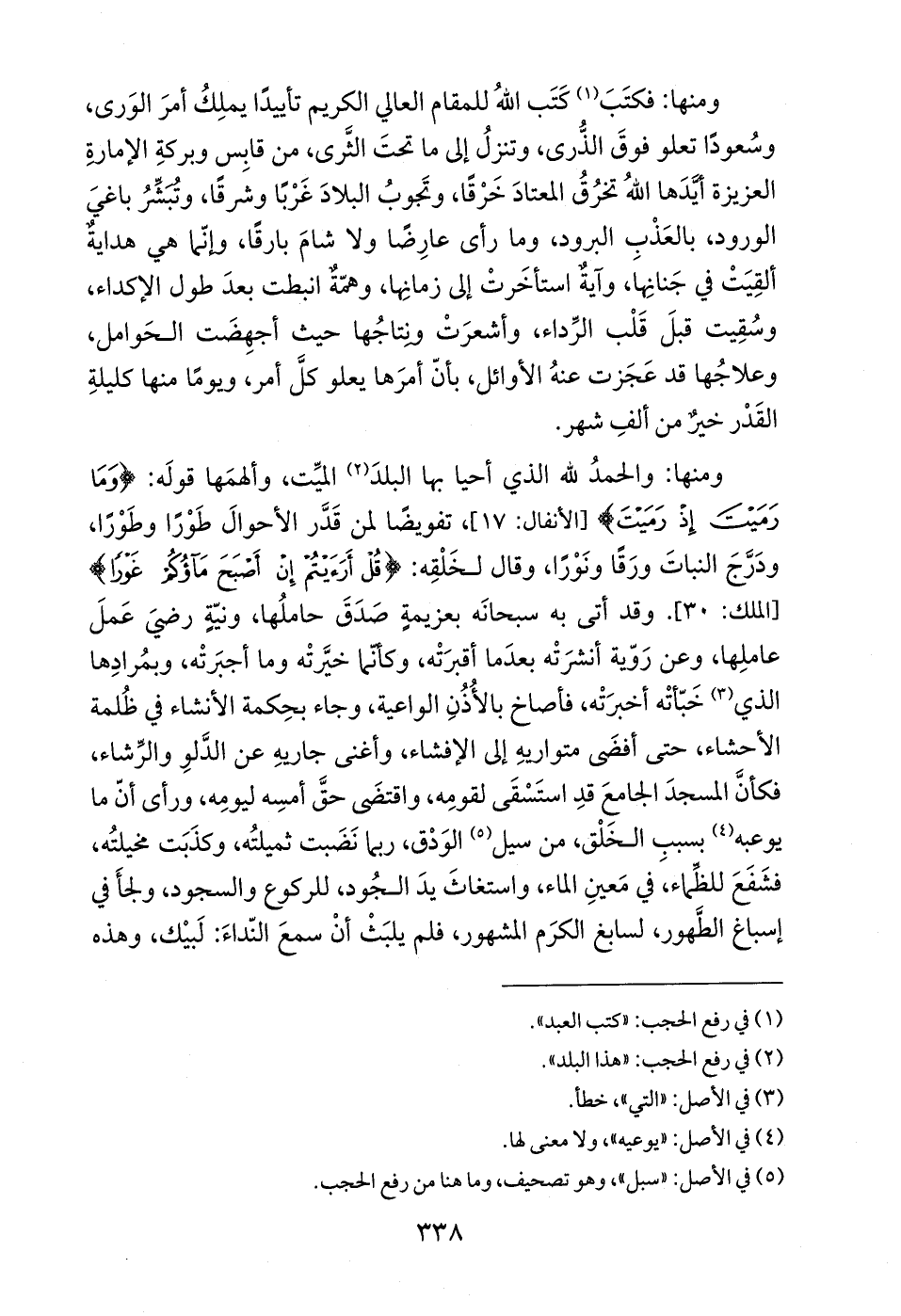 ومنها: والحمدُ لله الذي أحيا بها البلدَ (¬2) الميِّت، وألهمَها قولَه: {وَمَا رَمَيْتَ إِذْ رَمَيْتَ} [الأنفال: 17]، تفويضًا لمن قَدَّر الأحوالَ طَوْرًا وطَوْرًا، ودَرَّجَ النباتَ ورَقًا ونَوْرًا، وقال لخَلْقِه: {قُلْ أَرَأَيْتُمْ إِنْ أَصْبَحَ مَاؤُكُمْ غَوْرًا} [الملك: 30]. وقد أتى به سبحانَه بعزيمةٍ صَدَقَ حاملُها، ونيّةٍ رضيَ عَملَ عاملِها، وعن رَوّية أنشرَتْه بعدَما أقبرَتْه، وكأنّما خيَّرتْه وما أجبَرتْه، وبمُرادِها الذي (¬3) خَبّأتْه أخبرَتْه، فأصاخ بالأُذُنِ الواعية، وجاء بحِكمة الأنشاء في ظُلمة الأحشاء، حتى أفضَى متواريهِ إلى الإفشاء، وأغنى جاريهِ عن الدَّلوِ والرِّشاء، فكأنَّ المسجدَ الجامعَ قدِ استَسْقَى لقومِه، واقتضى حقَّ أمسِه ليومِه، ورأى أنّ ما يوعبه (¬4) بسبب الخَلْق، من سيل (¬5) الوَدْق، ربما نَضَبت ثميلتُه، وكذَبَت مخيلتُه، فشَفَعَ للظِّماء، في مَعينِ الماء، واستغاثَ يدَ الجُود، للركوع والسجود، ولجأَ في إسباغ الطَّهور، لسابغ الكرَم المشهور، فلم يلبَثْ أنْ سمعَ النّداءَ: لَبيْك، وهذه