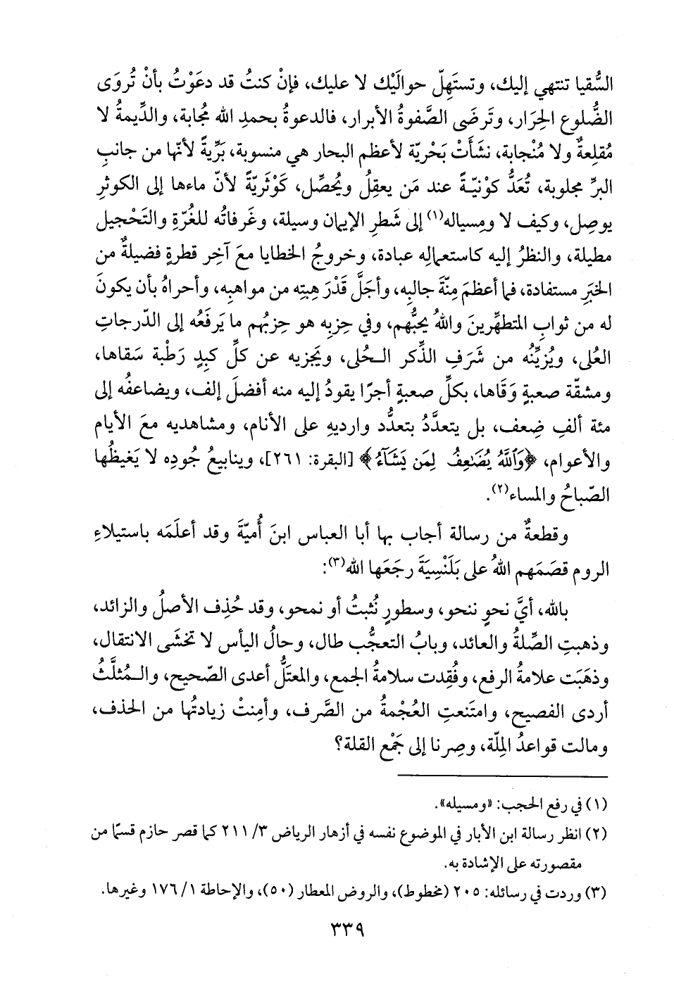 السُّقيا تنتهي إليك، وتستَهِلّ حوالَيْك لا عليك، فإنْ كنتُ قد دعَوْتُ بأنْ تُروَى الضُّلوع الحِرَار، وتَرضَى الصَّفوةُ الأبرار، فالدعوةُ بحمدِ الله مُجابة، والدِّيمةُ لا مُقلِعةٌ ولا مُنْجابة، نشَأَتْ بَحْريّة لأعظم البحار هي منسوبة، بَرِّيةً لأنّها من جانبِ البرِّ مجلوبة، تُعَدُّ كوْنيّةً عند مَن يعقِلُ ويُحصِّل، كَوْثَريّةً لأنّ ماءها إلى الكوثرِ يوصِل، وكيف لا ومِسياله (¬1) إلى شَطرِ الإيمان وسيلة، وغَرفاتُه للغُرّةِ والتَحْجيل مطيلة، والنظرُ إليه كاستعمالِه عبادة، وخروجُ الخطايا معَ آخِر قطرةٍ فضيلةٌ من الخبَرِ مستفادة، فما أعظمَ مِنّةَ جالبِه، وأجَلَّ قَدْرَ هِبتِه من مواهبِه، وأحراهُ بأن يكونَ له من ثواب المتطهِّرينَ واللهُ يحبُّهم، وفي حِزبِه هو حِزبُهم ما يَرفَعُه إلى الدّرجاتِ العُلى، ويُزَيِّنُه من شَرَفِ الذِّكر الحُلى، ويَجزيه عن كلِّ كبِدٍ رَطْبة سَقاها، ومشقّة صعبةٍ وَقَاها، بكلِّ صعبةِ أجرًا يقودُ إليه منه أفضلَ إلف، ويضاعفُه إلى مئة ألفِ ضِعف، بل يتعدَّدُ بتعدُّد وارديهِ على الأنام، ومشاهديه معَ الأيام والأعوام، {وَاللَّهُ يُضَاعِفُ لِمَنْ يَشَاءُ} [البقرة: 261]، وينابيعُ جُودِه لا يَغيظُها الصّباحُ والمساء (¬2).