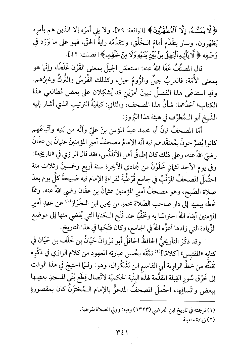 أمّا المصحفُ فإنّ أبا محمد عبدَ المؤمن بنَ عليّ وآلَه من بَنيه وأتْباعَهمِ كانوا يُصرِّحونَ بمُعتقَدهم فيه أنّه الإمامُ مصحفُ أميرِ المؤمنينَ عثمانَ بن عفّان رضيَ اللهُ عنه، وعلى ذلك كان إطباقُ أهل الأندَلُس، فقد قال الرازي في "تاريخِه": وفي يوم الأحد لثمانٍ خَلَوْنَ من جُمادى الآخِرة سنة أربع وخمسينَ وثلاث مئة احتُملَ المصحفُ المرَتَّبُ في جامع قُرْطُبةَ لقراءةِ الإمام فيه صَبيحةَ كلِّ يوم بعدَ صلاة الصّبح، وهو مصحفُ أميرِ المؤمنين عثمانَ بن عفّان رضي اللهُ عنه. وممّا خَطَّه بيمينِه إلى دار صاحب الصّلاة محمدِ بن يحيى ابن الخَرّاز (¬1) عن عهدِ أميرِ المؤمنين أبقاه اللهُ احتراسًا به وتحَفِّيًا عند فَتْح الحَنايا التي يُفضي منها إلى موضع الزِّيادة التي زادها أعزَّه اللهُ في الجامع، وكان فتَحَها في هذا التاريخ.