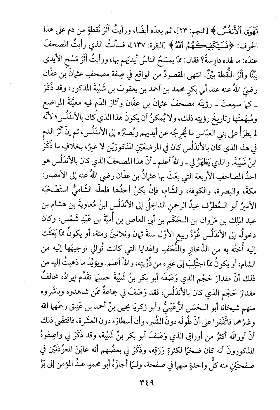 تَهْوَى الْأَنْفُسُ} [النجم: 23]، ثم بعدَه أيضًا، ورأيتُ أثَرَ نُقطةٍ من دم على هذا الحرف: {فَسَيَكْفِيكَهُمُ اللَّهُ} [البقرة: 137]، فسألتُ الذي رأيتُ المصحفَ عندَه: ما لهذه دارِسةً؟ فقال: ممّا يمسَحُ الناسُ أيديَهم بها، ورأيتُ أثَرَ مَسحِ الأيدي بيِّنًا وأثَرُ النُّقطة بيِّنٌ. انتهى المقصودُ من الواقع في صِفة مصحفِ عثمانَ بن عفّان رضيَ اللهُ عنه عند أبي بكرٍ محمد بن أحمد بن يعقوبَ بن شَيْبةَ المذكور، وقد ذَكَرَ -كما سمِعتَ- رؤيتَه مصحفَ عثمانَ بن عفّان وآثارَ الدّمِ فيه معيَّنةَ المواضع ومُبهَمتَها وتاريخَ رؤيته ذلك، ولا يُمكنُ أن يكونَ هذا الذي كان بالأندَلُس؛ لأنّه لم يطرَأْ على بني العبّاس ما يُخرِجُه عن أيديهم وُيصيِّرُه إلى الأندَلُس، ثم إنّ أثَرَ الدمِ في هذا الذي كان بالأندَلُس كان في الموضعَيْنِ المذكورين لا غيرُ، بخلافِ ما ذَكَرَ ابنُ شَيْبةَ. والذي يَظهَرُ لي -واللهُ أعلم- أنّ هذا المصحفَ الذي كان بالأندَلُس هو أحدُ المصاحفِ الأربعة التي بعَثَ بها عثمانُ بن عفّان رضي اللهُ عنه إلى الأمصار: مكةَ، والبصرة، والكوفة، والشّام، فإنْ يكنْ أحدُها فلعلّه الشّاميُّ استَصحَبَه الأميرُ أبو المُطرِّف عبدُ الرحمنِ الداخِلُ إلى الأندَلُس ابنُ مُعاويةَ بن هشام بن عبد الملِك بن مَرْوان بن الحَكَم بن أبي العاص بن أميّةَ بن عَبْدِ شَمْس، وكان دخولُه إلى الأندَلُس غُرّةَ ربيع الأوّلى سنةَ ثمان وثلاثينَ ومئة، أو يكونُ ممّا بَعَثَت إليه أُختُه به من الذّخائرِ والتُّحَفِ والهدايا التي كانت تُوالي توجيهَها إليه من الشام، أو يكونُ ممّا اجتُلِبَ إلى غيرِه من ذُرِّيتِه، واللهُ أعلم. ويؤيِّدُ ما ذهبتُ إليه من ذلك أنّ مقدارَ حَجْم الذي وَصَفَه أبو بكر بنُ شَيْبةَ حسبَما تقَدَّم إيرادُه مخالفٌ مقدارَ حَجْم الذي كان بالأندَلُس، فقد وَصَفَ لي جماعةٌ ممن شاهدوه وباشَروه منهم شيخانا أبو الحَسَن الرُّعَيْنيُّ وأبو زكريّا يحيى بنُ أحمد بن عَتِيق رحمَهما الله وغيرُهما فاتَّفَقوا على أنّ طُولَه دونَ الشِّبر، وأن أسطارَه دون العشَرة، فاقتضَى ذلك أنّ أوراقَه أكثرُ من أوراقِ الذي وَصَفَ أبو بكر بنُ شَيْبة، وقد ذَكَرَ لي واصِفوهُ المذكورونَ أنه كان ضخمًا لكثرةِ وَرَقه، وذَكَرَ لي بعضُهم أنه عايَنَ المعوِّذتَيْن في صفحتَيْنِ منه كلُّ واحدةٍ منهما في صفحة، ولمّا أجازَهُ أبو محمدٍ عبدُ المؤمن إلى بَرِّ