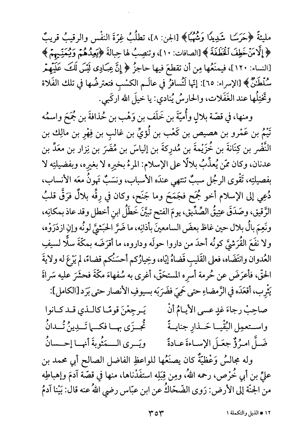 ومنها، في قصّة بلالٍ وأُميّةَ بن خَلَف بن وَهْب بن حُذافةَ بن جُمَحَ واسمُه تَيْمُ بن عَمْرو بن هصيص بن كَعْب بن لُؤيِّ بن غالبِ بن فِهْرِ بن مالِك بن النَّضْر بن كِنَانةَ بن خُزَيْمةَ بن مُدرِكةَ بن إلياسَ بن مُضَرَ بن نِزار بن معَدِّ بن عدنان، وكان ممّن يُعذِّبُ بلالًا على الإسلام: المرءُ بضره لا بغيرِه، وبفضيلتِه لا بفصيلتِه، تَقْوى الرجُل سببٌ تنتهي عندَه الأسباب، ونسَبٌ تَهونُ معَه الأنساب، دُعِي إلى الإسلام أخو جُمَح فجَمَحَ وما جَنَح، وكان في رِقِّه بلالٌ فرَقَّ قلبُ الرَّقيق، وصَدَقَ عتِيقُ الصِّدِّيق، يومَ الفتح تبيَّنَ خَطَلُ ابنِ أخطل وقد عاذ بمكانِه، ونَعِمَ بالُ بلال حين غاظ بعضَ السامعينَ بأذانِه، ما ضَرَّ الحبَشيَّ لونُه وإنِ ازدَرَوْه، ولا نفَعَ القُرَشيَّ كونُه أحدَ من داروا حولَه وداروه، ما أقرَضَه بمكّةَ سلًّا لسيفِ العُدوان وانتَضَاه، فعلى القَليبِ قَضاهُ إيّاه، وخِيارُكم أحسَنكم قضاءً، لم يَرْعَ له ولايةَ الحقّ، فأعرَضَ عن حُرمة أسرِه المستحَقّ، أغرى به سُفهاءَ مكّةَ فحشَرَ عليه سَراةَ يَثْرِب، أقعَدَه في الرَّمضاءِ حتى حَمِيَ فضَرَبَه بسيوفِ الأنصار حتى بَرَد [الكامل]: