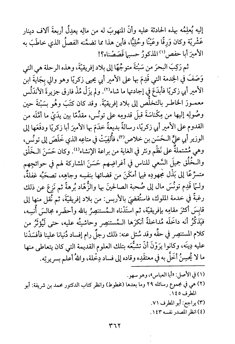 ثم رَكِبَ البحرَ من سَبْتةَ متوجِّهًا إلى بلاد إفريقيّةَ، وهذه الرحلة هي التي وَصَفَ في الخِدمة التي قَدِمَ بها على الأمير أبي يحيى زكريّا وهو والي بِجَايةَ ابن الأمير أبي زكريّا فأبدَعَ في إجادتها ما شاء (¬2). ولم يزَلْ مُذْ فارق جزيرةَ الأندَلُس معمورَ الخاطر بالتخلُّص إلى بلاد إفريقيّةَ. وقد كان كتَبَ وهُو بسَبْتةَ حين وصُولِه إليها من مِكْناسَةَ قبلَ قدومِه علىٍ تونُس، مقدِّمًا بين يدَيْ ما أمَّلَه من القدوم على الأمير أبي زكريّا، رسالةً بديعةً خدَمَ بها الأميرَ أبا زكريّا ودفَعَها إلى الوزير أبي علي الحَسَن بن خلاص (¬3)، فأُلفِيَتْ في متاعِه الذي خَلَصَ إلى تونُس، وهي مُشتملةٌ على نَظْم ونثر في الغاية من براعة الإنشاء (¬4). وكان حَسَنَ الخَلْق والخُلُق جميلَ السَّعي للناس في أغراضِهم حَسَنَ المشاركة لهم في حوائجِهم متسرِّعًا إلى بَذْل مجهودِه فيما أمكَنَ من قضائها بنفسِه وجاهِه، تصحَبُه غفلةٌ، ولمّا قَدِم تونُسَ مال إلى صُحبة الصالحينَ بها والزُّهّاد بُرهةً ثم نَزعَ عن ذلك رغبةً في خدمة الملوك، فاستُقضيَ بالأربس: من بلاد إفريقيّةَ، ثم نُقل منها إلى قابِسَ أكثرَ مقامِه بإفريقيّة، ثم استَدْناه المُستنصِرُ بالله وأحضَره مجالسَ أُنسِه، فيَذكُرُ أنه داخَلَه مُداخلةً أنكرَها المُستنصِر وحاشيتُه عليه، حتى لَيُؤثَرُ من كلام المستنصِر في حقِّه وقد سُئل عنه: ذلك رجلٌ رام إفساد دُنيانا علينا فأفسَدْنا عليه دِينَه، وكانوا يرَوْنَ أنّ تشبُّعَه بتلك العلوم القديمة التي كان يتعاطى منها ما لا يُحسِنُ أخَلَّ به في معتقَدِه وقاده إلى فساد دِخْلة، واللهُ أعلم بسريرتِه.