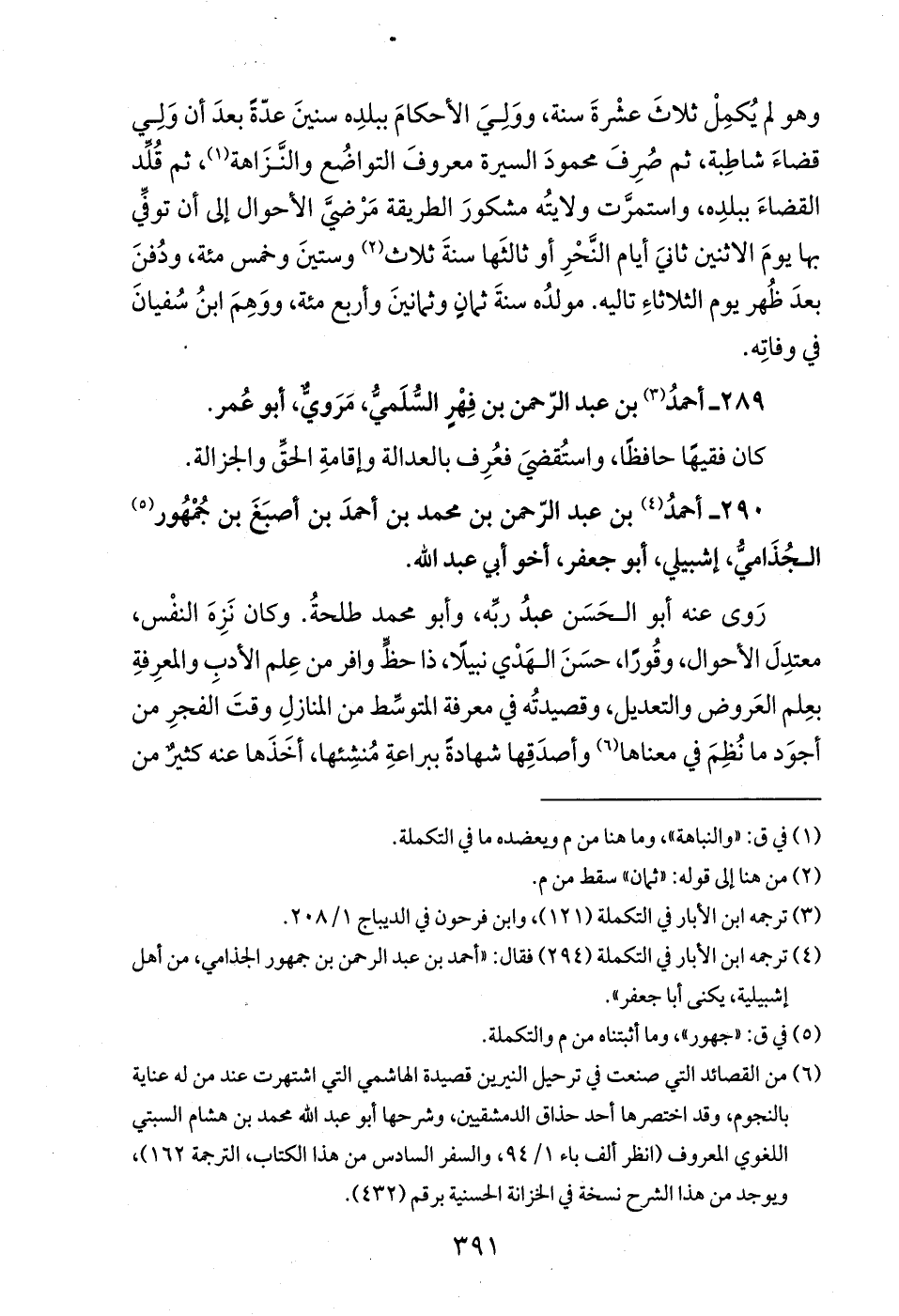 (¬4) ترجمه ابن الأبار في التكملة (294) فقال: "أحمد بن عبد الرحمن بن جمهور الجذامي، من أهل إشبيلية، يكنى أبا جعفر".