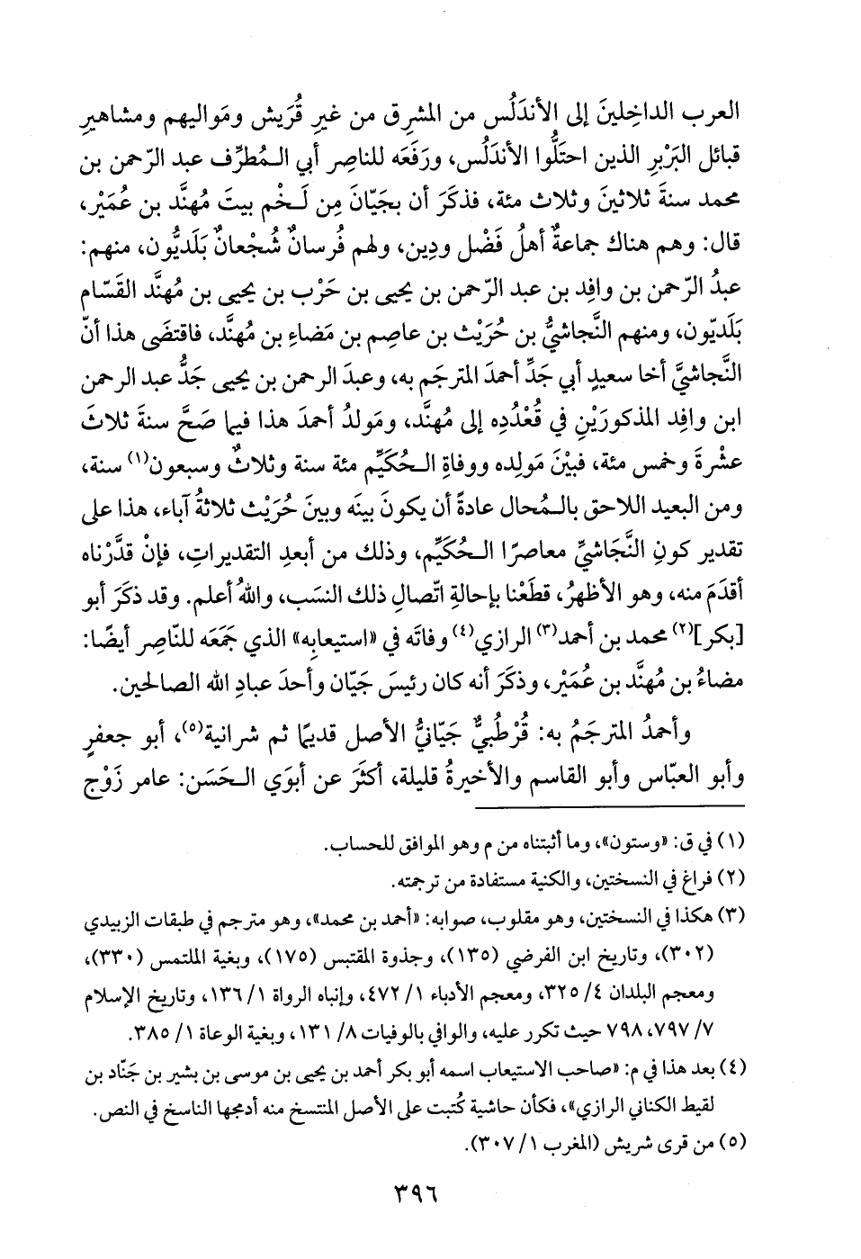 العرب الداخِلينَ إلى الأندَلُس من المشرِق من غيرِ قُرَيش ومَواليهم ومشاهيرِ قبائل البَرْبرِ الذين احتَلُّوا الأندَلُس، ورَفَعَه للناصِر أبي المُطرِّف عبد الرّحمن بن محمد سنةَ ثلاثينَ وثلاث مئة، فذكَرَ أن بجَيّانَ مِن لَخْم بيتَ مُهنَّد بن عُمَيْر، قال: وهم هناك جماعةٌ أهلُ فَضْل ودِين، ولهم فُرسانٌ شُجْعان بَلَديُّون، منهم: عبدُ الرّحمن بن وافِد بن عبد الرّحمن بن يحيى بن حَرْب بن يحيى بن مُهنَّد القَسّام بَلَديّون، ومنهم النَّجاشيُّ بن حُرَيْث بن عاصِم بن مَضاءِ بن مُهنَّد، فاقتضَى هذا أنّ النَّجاشيَّ أخا سعيدٍ أبي جَدِّ أحمدَ المترجَم به، وعبدَ الرحمن بن يحيى جَدُّ عبد الرحمن ابن وافِد المذكورَيْنِ في قُعْدُدِه إلى مُهنَّد، ومَولدُ أحمدَ هذا فيما صَحَّ سنةَ ثلاثَ عشْرةَ وخمس مئة، فبيْنَ مَولِده ووفاةِ الحُكَيِّم مئة سنة وثلاثٌ وسبعون (¬1) سنة، ومن البعيد اللاحق بالمُحال عادةً أن يكونَ بينَه وبينَ حُرَيْث ثلاثةُ آباء، هذا على تقدير كونِ النَّجَاشيِّ معاصرًا الحُكَيِّم، وذلك من أبعدِ التقديراتِ، فإنْ قدَّرْناه أقدَمَ منه، وهو الأظهرُ، قطَعْنا بإحالةِ اتّصالِ ذلك النسَب، واللهُ أعلم. وقد ذكَرَ أبو [بكر] (¬2) محمد بن أحمد (¬3) الرازي (¬4) وفاتَه في "استيعابه" الذي جَمَعَه للنّاصِر أيضًا: مضاءُ بن مُهنَّد بن عُمَيْر، وذكَرَ أنه كان رئيسَ جَيّان وَأحدَ عبادِ الله الصالحين.