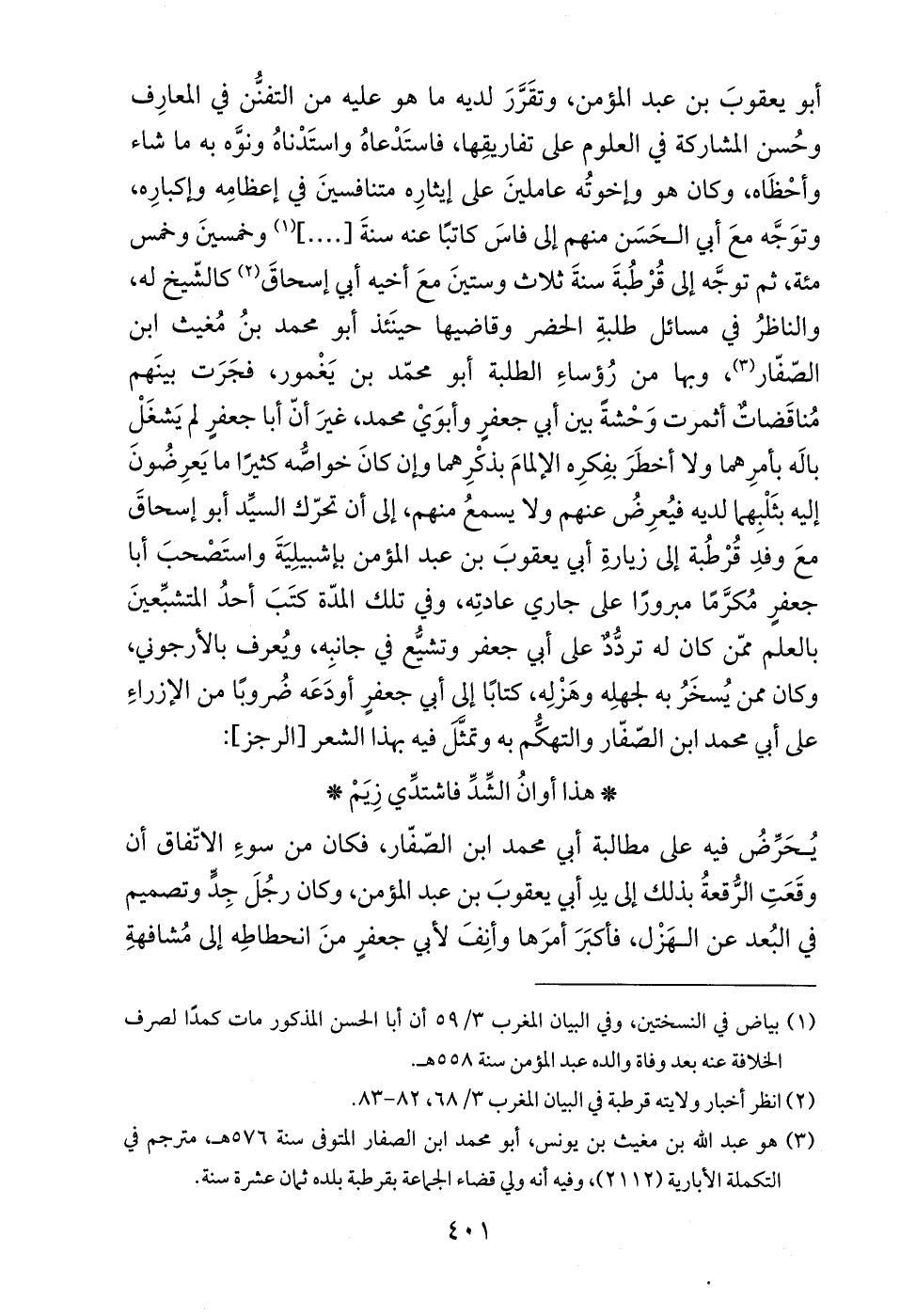 أبو يعقوبَ بن عبد المؤمن، وتقَرَّرَ لديه ما هو عليه من التفنُن في المعارِف وحُسن المشاركة في العلوم على تفاريقِها، فاستَدعاهُ واستَدناهُ ونوَّه به ما شاء وأحْظاه، وكان هو وإخوتُه عاملينَ على إيثارِه متنافسينَ في إعظامِه وإكبارِه، وتوَجَّه معَ أبي الحَسَنُ منهم إلى فاسَ كاتبًا عنه سنةَ [...] (¬1) وخمسينَ وخمس مئة، ثم توجَّه إلى قُرْطُبةَ سنةَ ثلاث وستينَ معَ أخيه أبي إسحاقَ (¬2) كالشّيخ له، والناظرُ في مسائل طلبةِ الحضر وقاضيها حينَئذ أبو محمد بنُ مُغيث ابن الصّفّار (¬3)، وبها من رُؤساءِ الطلبة أبو محمّد بن يَغْمور، فجَرَت بينَهم مُناقَضاتٌ أثمرت وَحشة بين أبي جعفرٍ وأبوَيْ محمد، غيرَ أنّ أبا جعفرٍ لم يَشغَلْ بالَه بأمرِهما ولا أخطَرَ بفِكرِه الإلمامَ بذكْرِهما وإن كانَ خواصُّه كثيرًا ما يَعرِضُونَ إليه بثَلْبِهما لديه فيُعرِضُ عنهم ولا يسمعُ منهم، إلى أن تحرّك السيِّد أبو إسحاقَ معَ وفدِ قُرطُبة إلى زيارةِ أبي يعقوبَ بن عبد المؤمن بإشبيلِيَةَ واستَصحبَ أبا جعفرٍ مُكرَّمًا مبرورًا على جاري عادتِه، وفي تلك المدّة كتَبَ أحدُ المتشبّعينَ بالعلم ممّن كان له تردُّدٌ على أبي جعفر وتشيُّع في جانبِه، وُيعرف بالأرجوني، وكان ممن يُسخَرُ به لجهلِه وهَزْلِه، كتابًا إلى أبي جعفرٍ أودَعَه ضُروباً من الإزراءِ على أبي محمد ابن الصّفّار والتهكُّم به وتمثَّل فيه بهذا الشعر [الرجز]:
